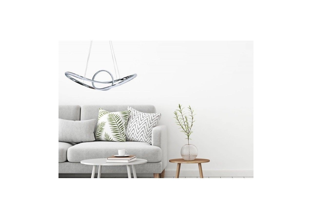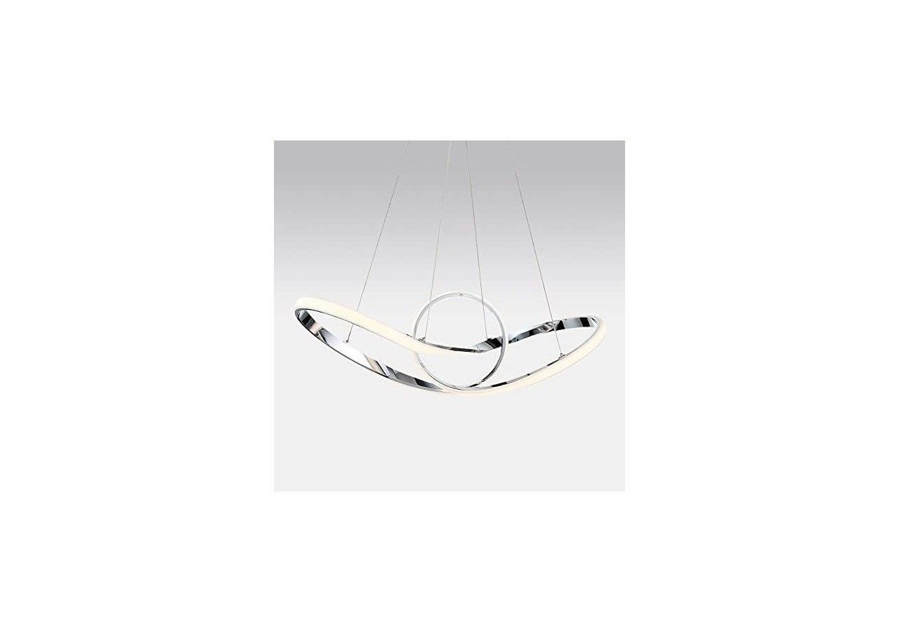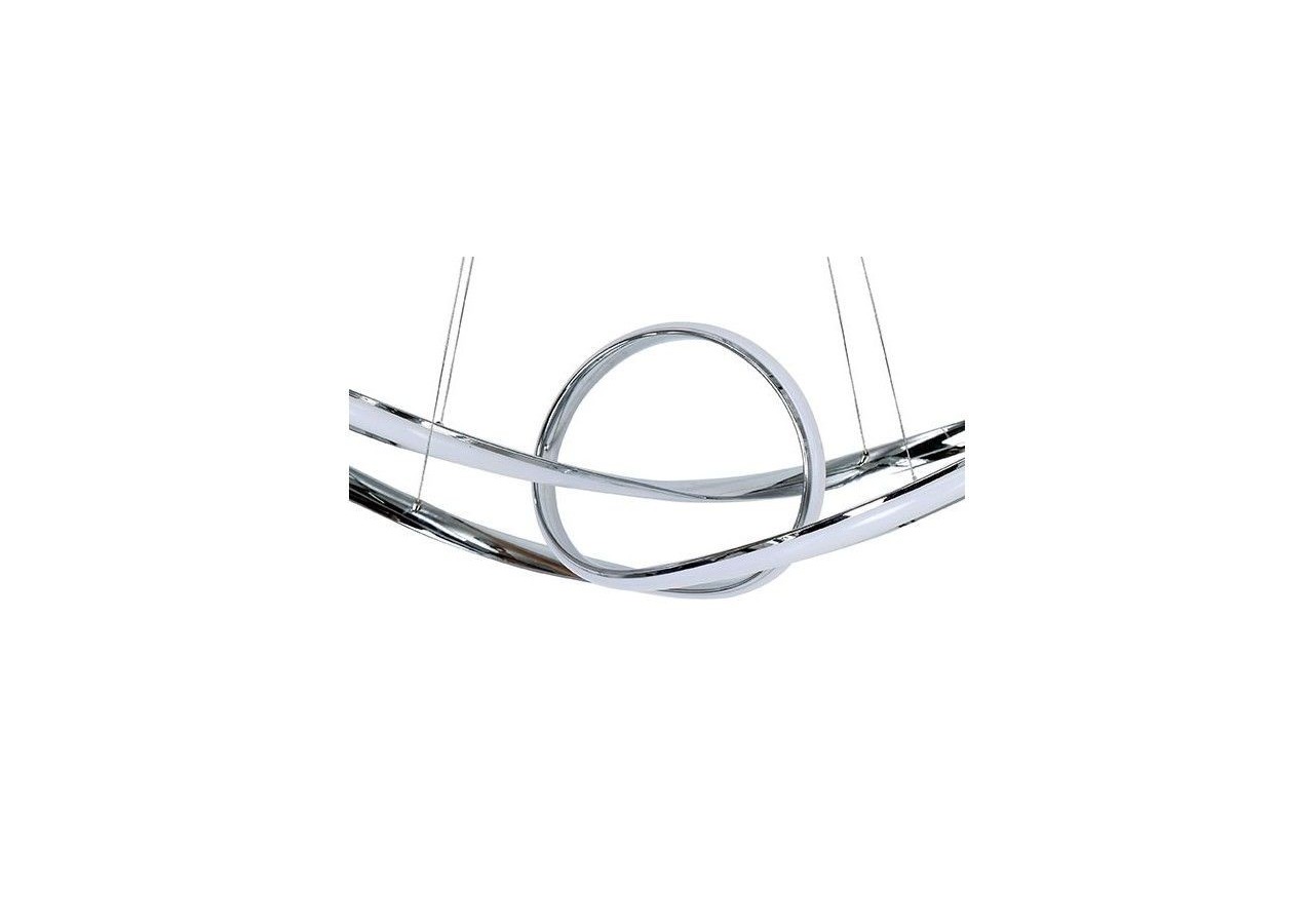 Suspension LED "Loren" 34W, très décorative avec ses anneaux chromés qui s'entremêlent en une structure futuriste.Suspendue au plafond par 4 câbles discrets fixés à la rosace cache-fils, elle donne l'impression de flotter dans les airs. Un dispositif de verrouillage permet d'ajuster la longueur des câbles lors de son installation, et ainsi d'ajuster la hauteur de la lampe à vos besoins. Un luminaire LED qui décore autant qu'il éclaire, idéal dans un salon, une salle à manger, un restaurant, une boutique, etc.