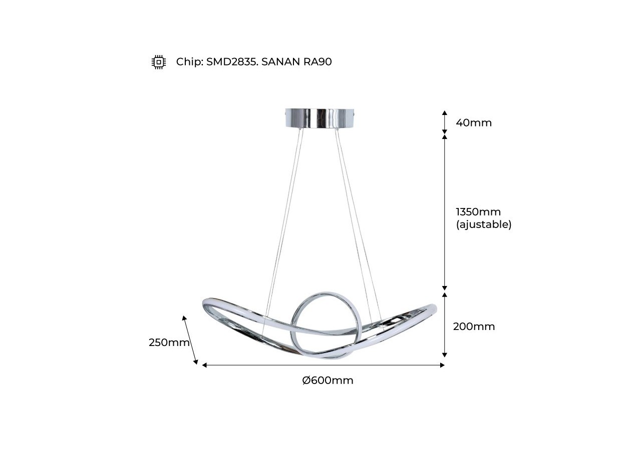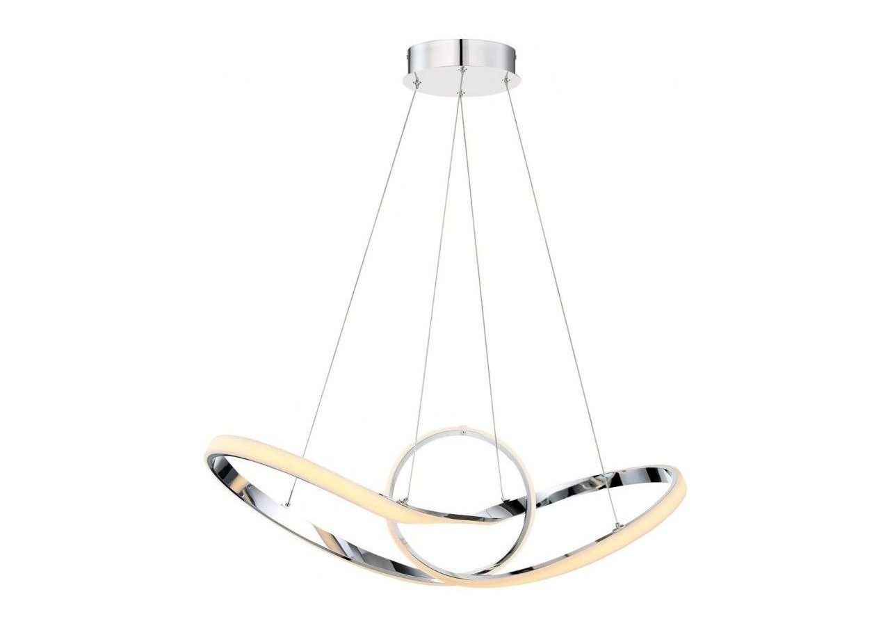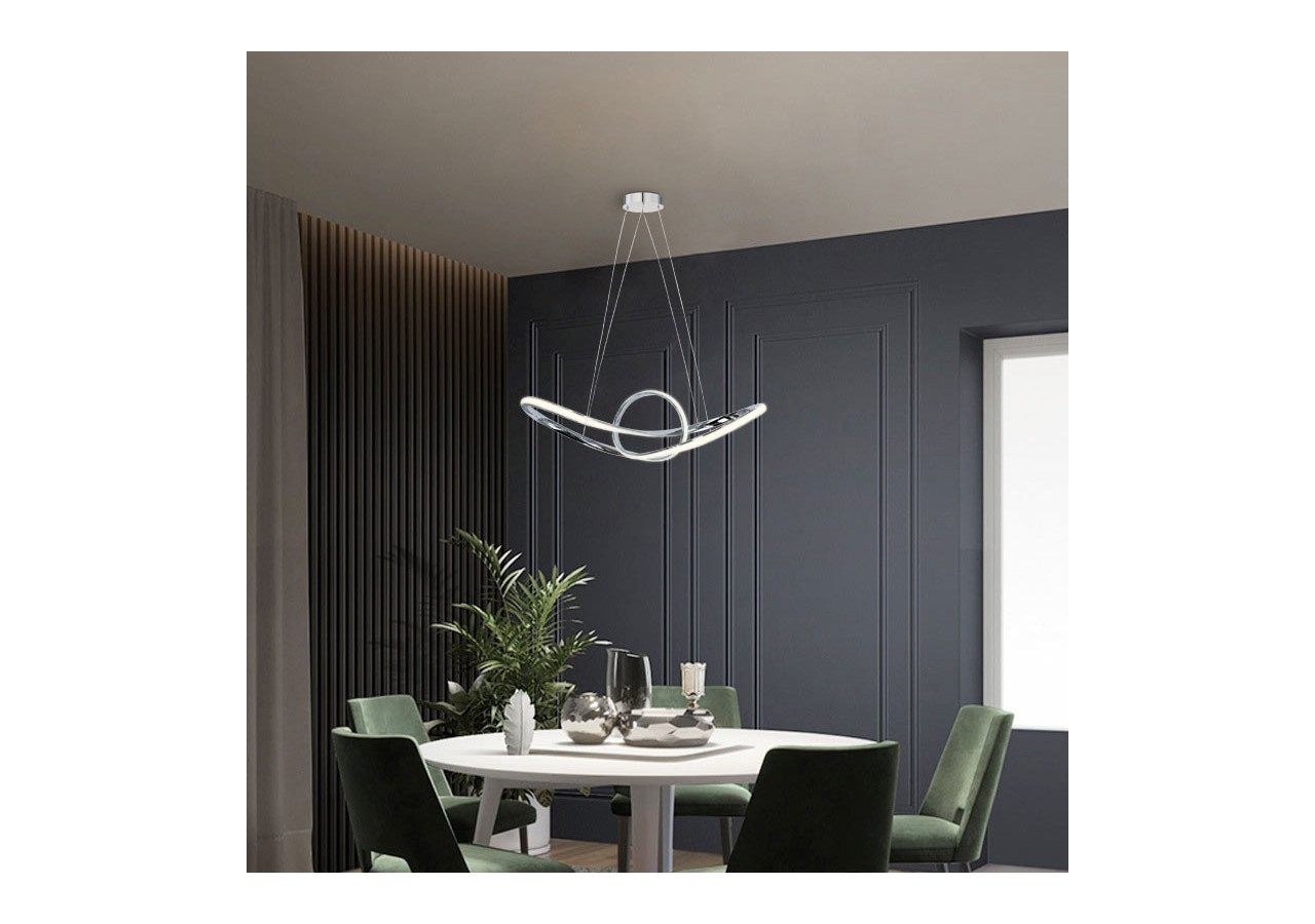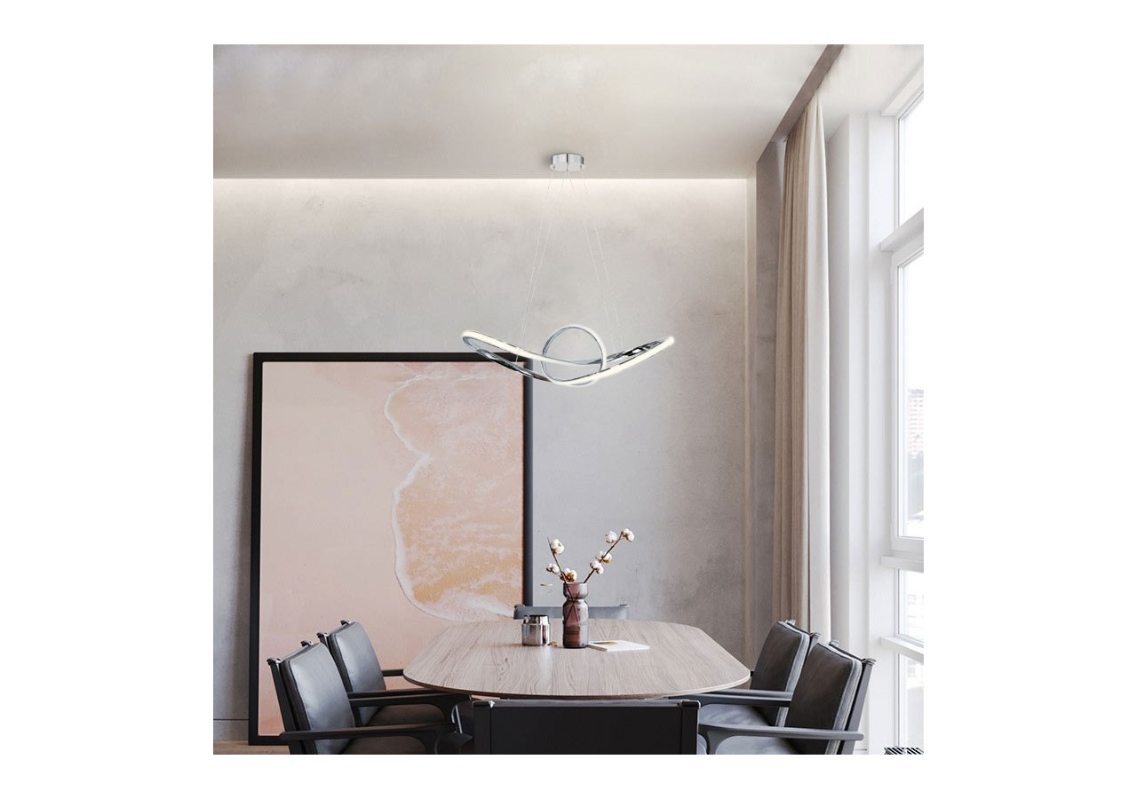 Suspension LED "Loren" 34W, très décorative avec ses anneaux chromés qui s'entremêlent en une structure futuriste.Suspendue au plafond par 4 câbles discrets fixés à la rosace cache-fils, elle donne l'impression de flotter dans les airs. Un dispositif de verrouillage permet d'ajuster la longueur des câbles lors de son installation, et ainsi d'ajuster la hauteur de la lampe à vos besoins. Un luminaire LED qui décore autant qu'il éclaire, idéal dans un salon, une salle à manger, un restaurant, une boutique, etc.