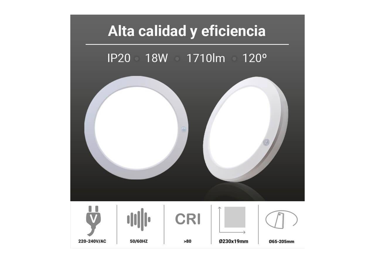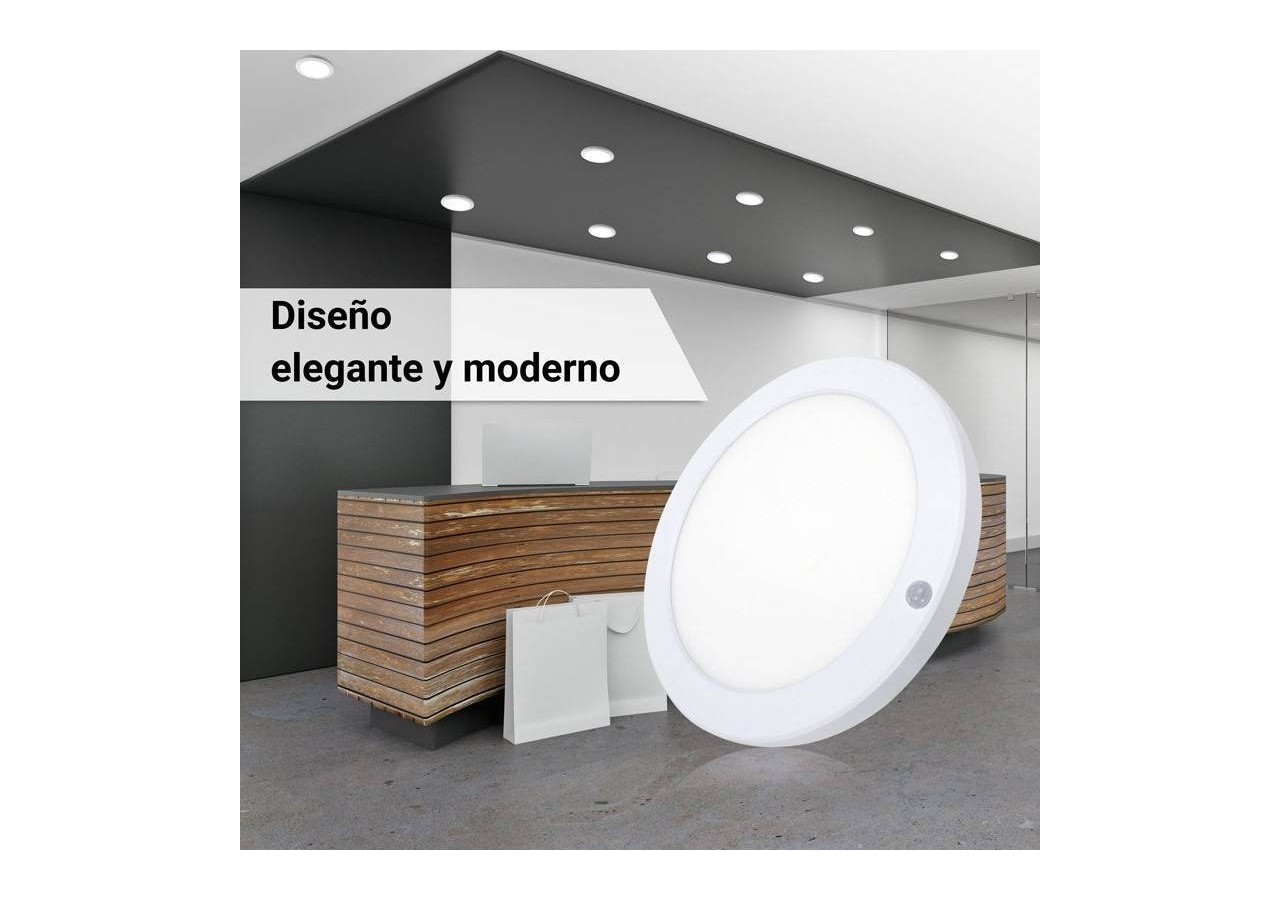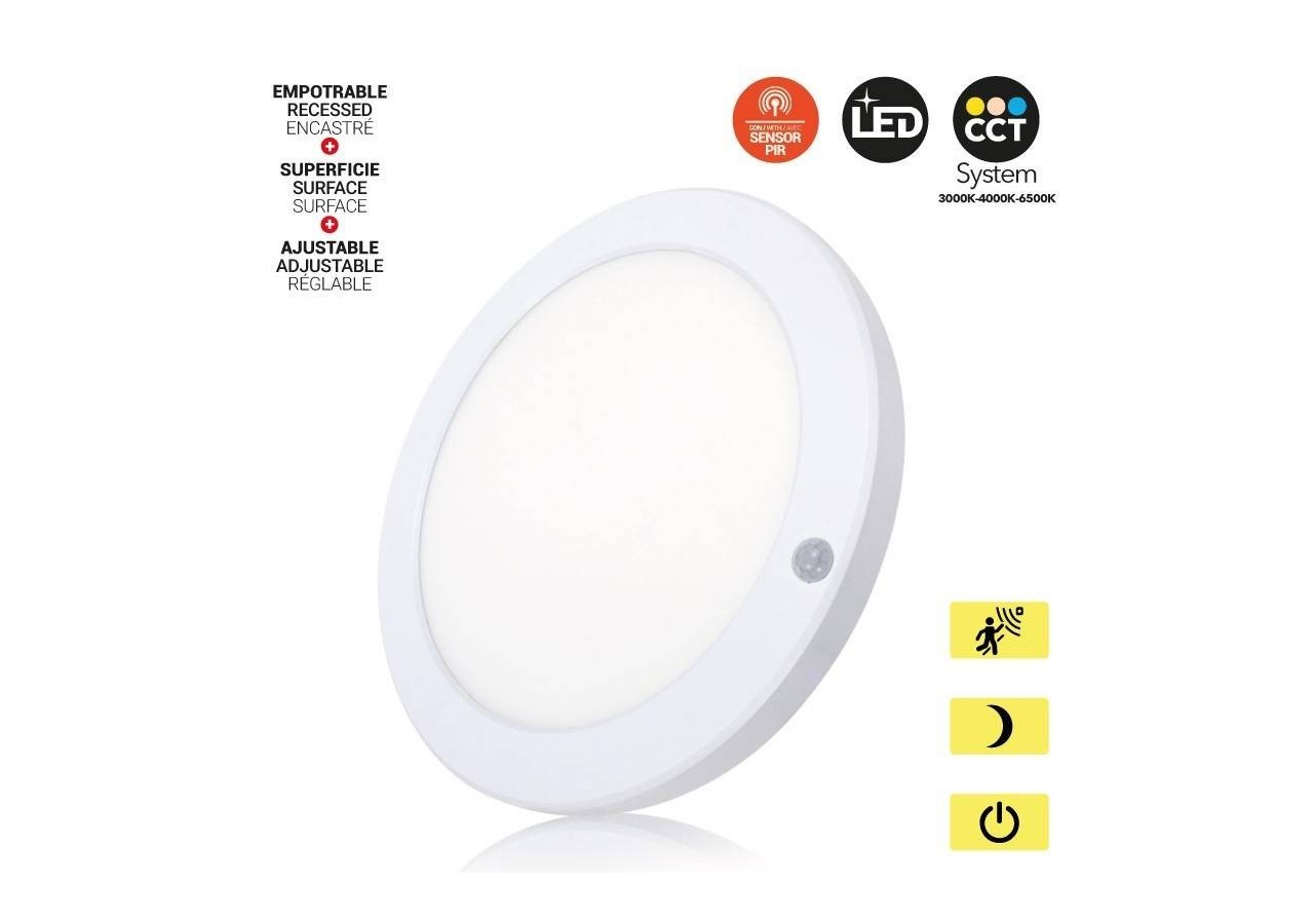 Plafonnier LED avec détecteur de mouvement à haut rendement lumineux affichant une puissance de 18W pour 1710 lumens. Si vous choisissez de l'encastrer, sachez que le diamètre de découpe est ajustable, de65 à 205 mm. L'angle d'ouverture du faisceau lumineux est de 120 degrés. Il s'agit d'un luminaire à haut rendement énergétique doté d'un capteur PIR de présence avec fonction crépusculaire.