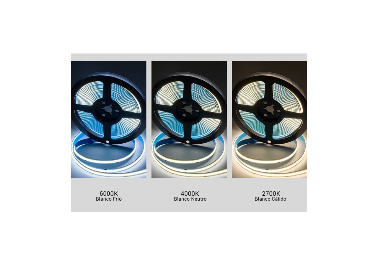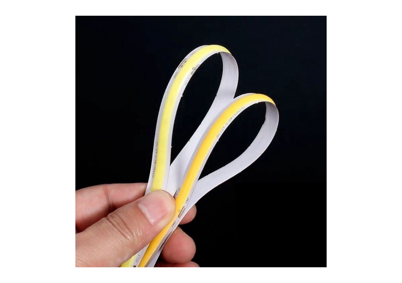 Ce ruban LED utilise la technologie COB, offrant une lumière continue et sans points visibles. Cela le rend particulièrement recommandé lorsque vous recherchez un éclairage homogène, que vous travaillez avec des surfaces réfléchissantes ou que vous utilisez des diffuseurs transparents.