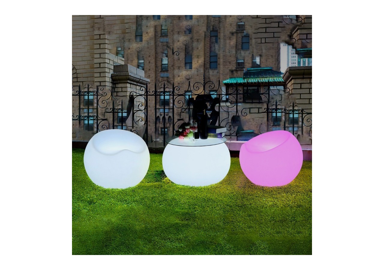 Éclairage LEDdécoratif pour intérieur/extérieur alliant fonctionnalité et esthétique. En intérieur, vous pouvez brancher votre fauteuil lumineux directement sur 220V grâce au câble de charge fourni et l'allumer dans la couleur de votre choix. En extérieur, il suffit de débrancher votre meuble pour une utilisation sur batterie (autonomie d'environ 8 heures). Entièrement fabriqué en polypropylène de qualité supérieure, c'est unmeuble LEDrobuste et durable qui se nettoie facilement et convient à tous types d'applications. Il intègre une plaque de puces LED RGBW au niveau de sa base pour une diffusion homogène de la lumière sur toute sa surface. Puissance de 2,4W, tension de 5V/CA, angle d'ouverture du faisceau lumineux de 120 degrés et dimensions de ø 560x460 mm.