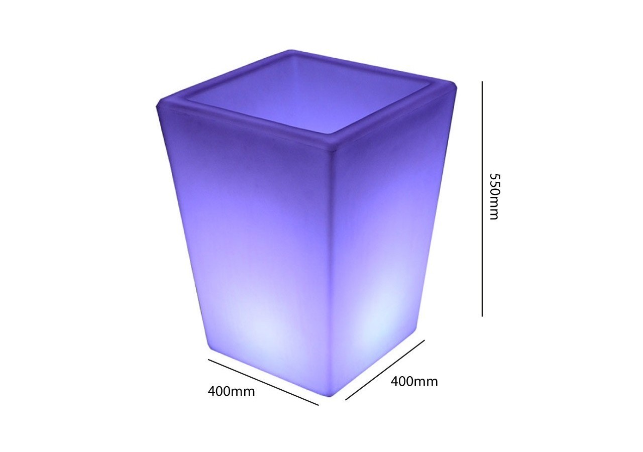 Lepot de fleur LED est constitué d'une section carrée de 400x400mm de large et 550mm de haut. Le système sans fil est fabriqué en résine de polyéthylène, un matériau recyclable et très résistant qui supporte parfaitement les conditions climatiques défavorables, les chocs et les rayons ultraviolets. En outre, vous pouvez utiliser le pot de fleur LED comme jardinière, table, en incorporant un verre sur le dessus ou vous pouvez le transformer en seau à glace LED.