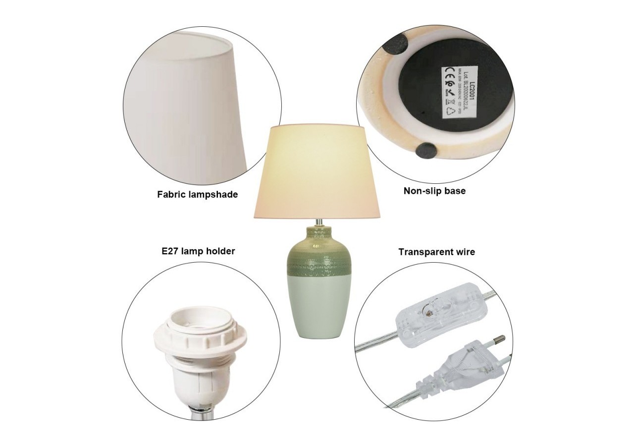 Le pied bicolore en céramique est muni de patins antidérapants sur le dessous. Cela garantit une meilleure stabilité au luminaire, et évite la formation de rayures sur votre mobilier. Très polyvalente, la lampe Hivea convient à tous types d'applications : lampe de lecture, lampe de chevet, lampe de bureau,lampe de salon, etc. Elle dispose d'un câble semi-transparent avec interrupteur de 150cm de long.