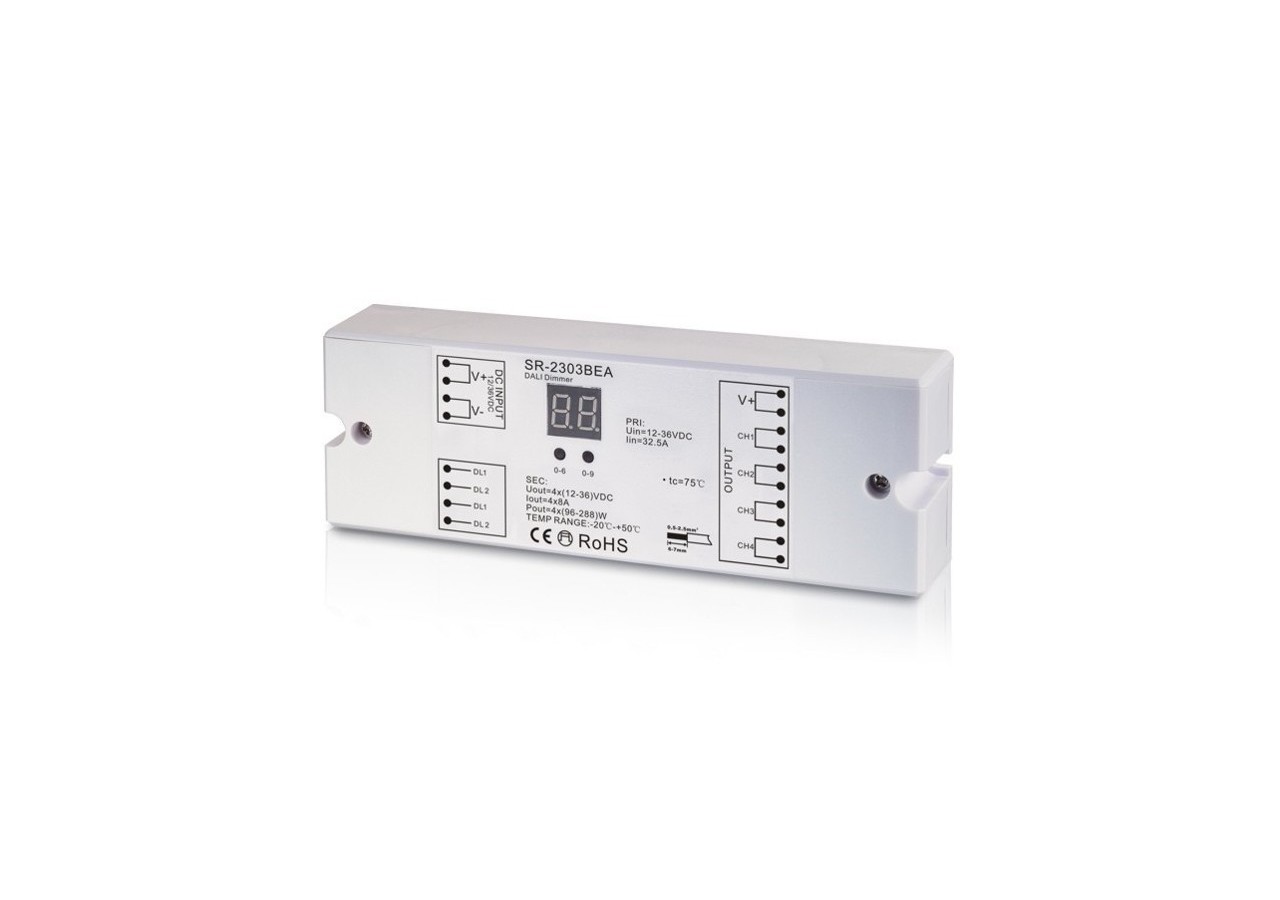 Le dimmer SR-2303BEA DALI est un contrôleur de gradation pour LED à tension constante avec 4 canaux de 8A chacun. Il est conforme au protocole DALI standard avec 4 adresses DALI pour contrôler 4 canaux séparément.
