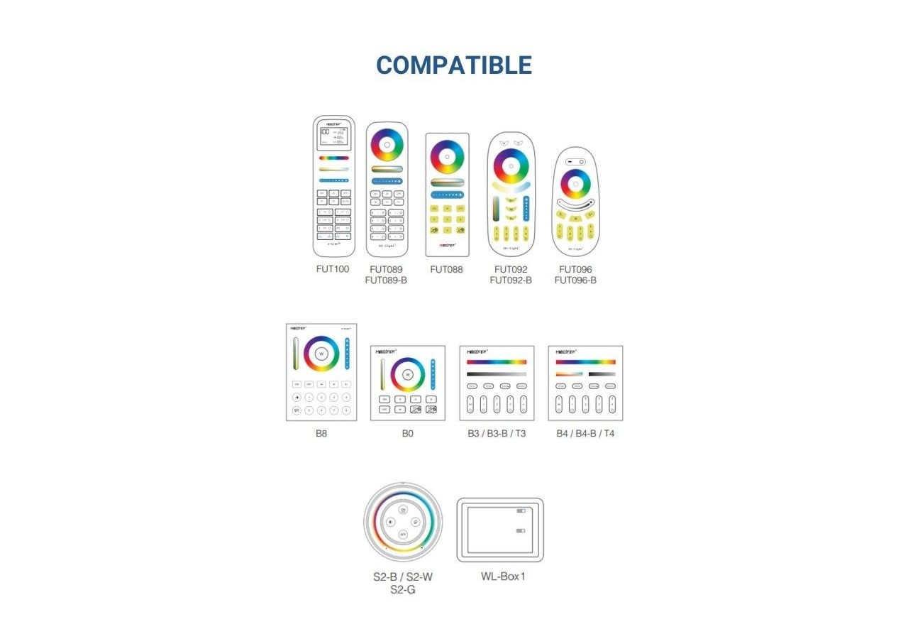 De plus, il est compatible avec une variété de contrôleurs Mi-Light / MiBoxer RGB + CCT et les télécommandes à radiofréquence RGB + CCT, offrant une polyvalence d'utilisation et une compatibilité avec différents systèmes de contrôle.