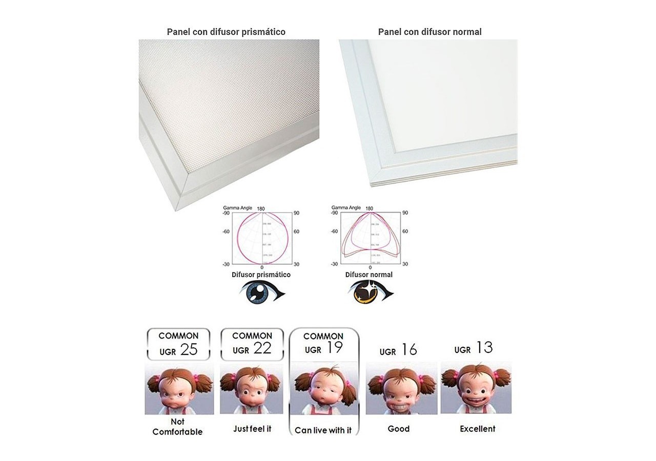 Faible indice d'éblouissement (UGR19). Avec driver philips haute performance, filtre CEM. Blanc chaud 3000ºK, 2822lm. Blanc neutre 4000ºK, 3432lm. Blanc froid 6000ºK, 3822lm. Efficacité lumineuse élevée de 87lm/W.