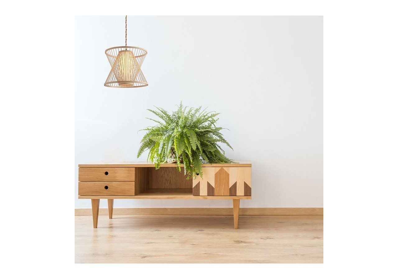 Elle est dotée d'un diffuseur central et d'un abat-jour en fibres de bambou au design symétrique original, permettant ainsi le passage fluide de la lumière vers l'extérieur.