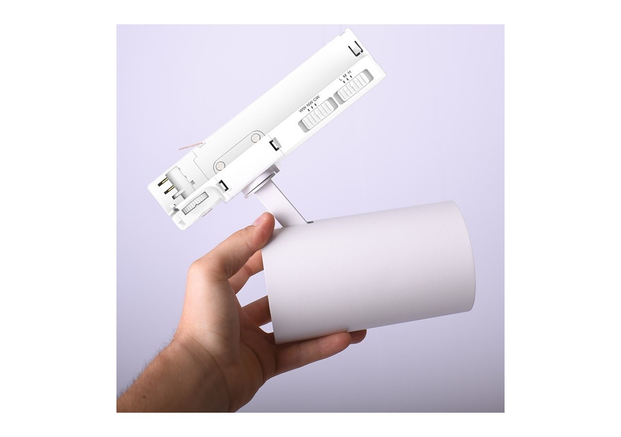 Projecteur sur rail triphasé avec trois réglages de puissance : 30W, 35W et 40W. Il est également doté d'un commutateur de sélection de la température CCT (blanc chaud 2700K, blanc neutre 4000K, blanc froid 6000K), qui vous permet de choisir entre ces températures, s'adaptant ainsi à la plupart des installations et des pièces.