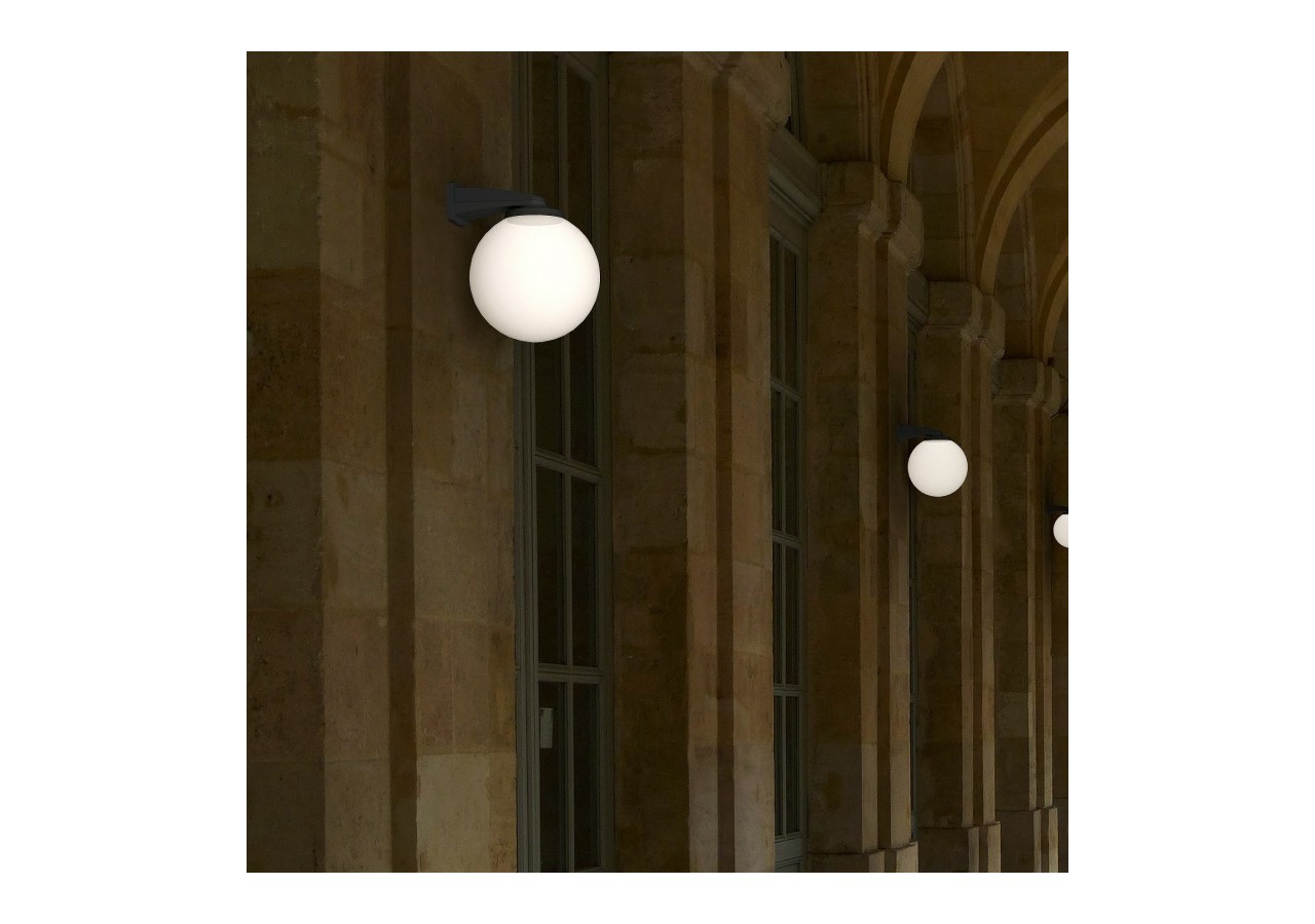Applique murale d'extérieur de la société italienne FUMAGALLI avec un design classique et un diffuseur en forme de sphère. Elle possède un support en résine résistant aux chocs, à la corrosion et à la dégradation par les rayons UV. Son indice de protection IP55 lui permet d'être utilisée en extérieur.