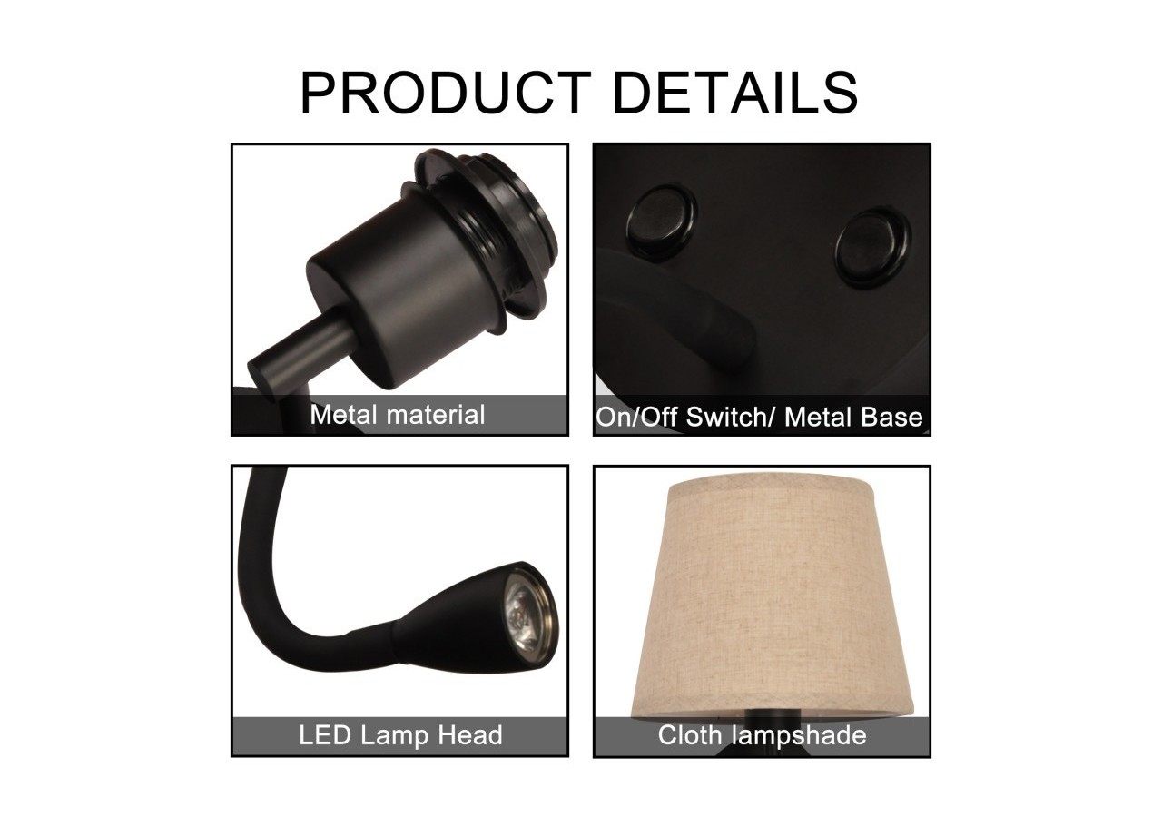 Elle est dotée d'un élégant abat-jour en tissu et équipée d'un spot LED réglable de 3W pour la lecture. De cette manière, elle vous permet ainsi de choisir entre l'éclairage général de l'abat-jour ou la lumière ponctuelle de son spot LED au moyen de deux interrupteurs indépendants.
