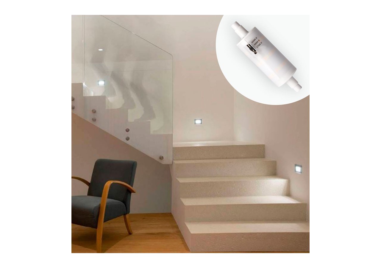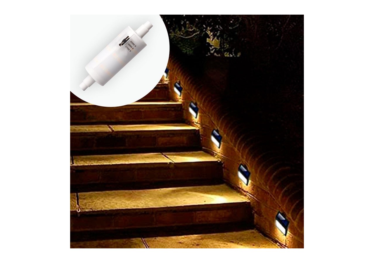 Ampoule LED R7S de marque Fumagalli, de 400 lumens pour 4W (soit 100lm/W) grâce à ses puces LED SMD3014 à haut rendement. Elle admet une large plage de tensions (100-240V) afin de protéger le driver contre d'éventuels problèmes de pic ou de chute de tension, fréquents avec les installations d'extérieur. De plus, elle est compatible avec des températures de fonctionnement allant de-30ºC à +80ºC, et peut donc s'utiliser jusque dans les environnements les plus exigeants. Certifiée IP44, c'est une ampoule adaptée à un usage extérieur dans un luminaire étanche. Avec la garantie qualité Fumagalli.