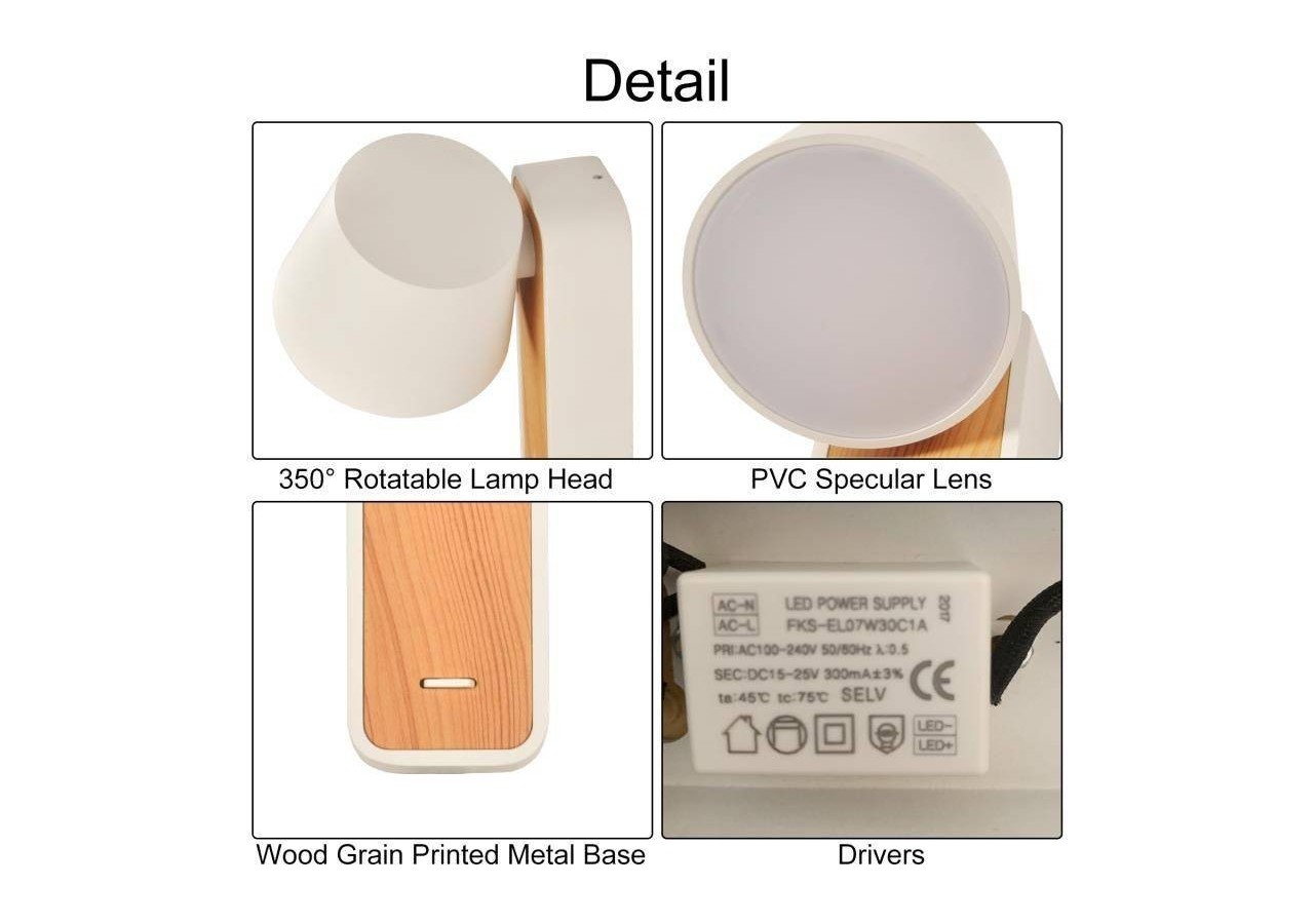 Superbeapplique au design scandinave. Elle se compose d'un support mural en métal blanc mat/effet bois avec interrupteur, et d'unspot LEDde 6Worientable à 350 degrés. L'angle d'ouverture du faisceau lumineux, d'une intensité de 520 lumens, est de 120 degrés. C'est un modèle d'intérieur sobre et élégant, parfait comme lampe de lecture ou d'appoint dans une chambre, un salon, un bureau, etc.
