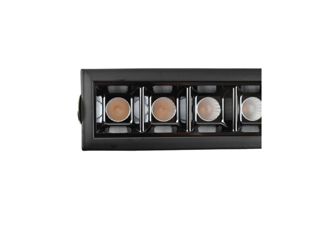 Linéaire LED encastrable de 30Wdisponible en noir ou blanc, affichantun bon IRC (> 90) et un faible indice d'éblouissement (UGR 18). Ses puces LED CREE totalisent 1950 lumens en blanc chaud (2700ºK), avec un angle d'ouverture de jusqu'à 45 degrés – idéal pour un éclairage d'ambiance ciblé. C'est un luminaire d'intérieur ultrafin, au rendu discret après encastrement. Les applications sont infinies : habitations, restaurants, bars, boutiques, bureaux, hôtels, musées, etc. Découpe :403x37mm.