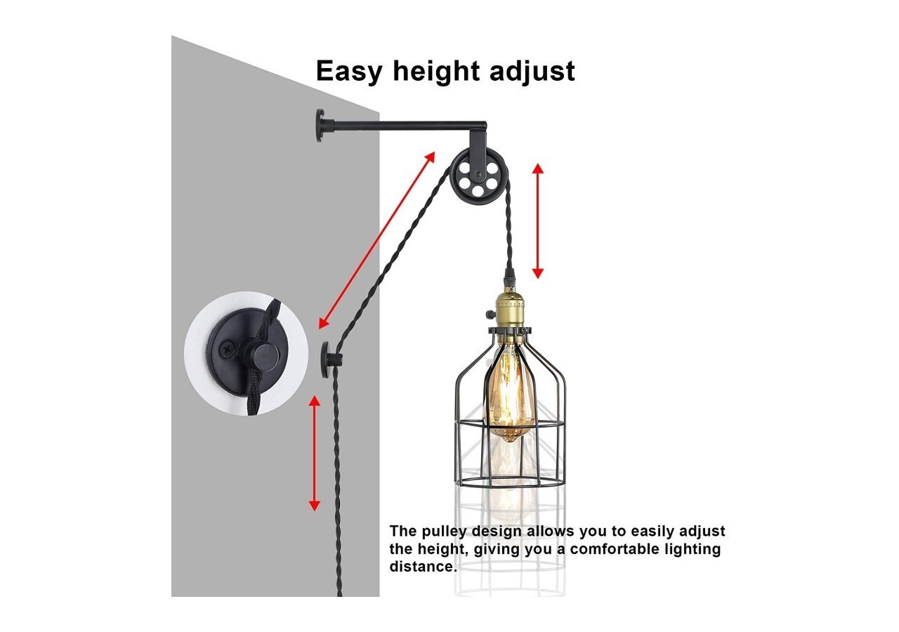 Superbe lampe murale réglable en hauteur grâce à un système de poulie qui ajoute à l'originalité de son design (longueur maximale du câble : 66,92 inches). Fabriquée en métal laqué noir, cette applique murale abrite une douille pour ampoule LED E27 – non fournie – d'une puissance maximum de 60W. Avec son design unique, cette suspension murale apporte une superbe touche finale à toutes les décorations, notamment de style vintage ou industriel. Luminaire LED certifié IP20, réservé à un usage intérieur.