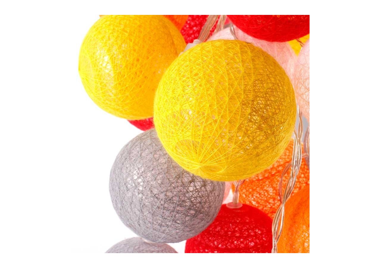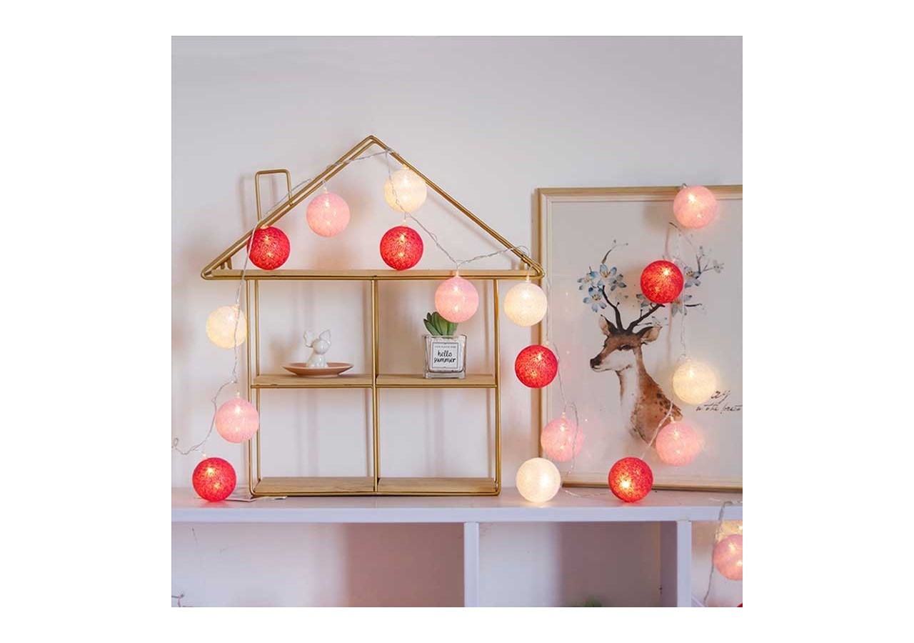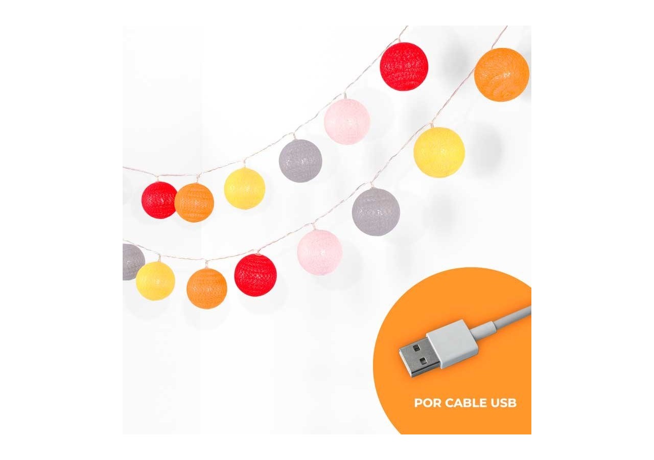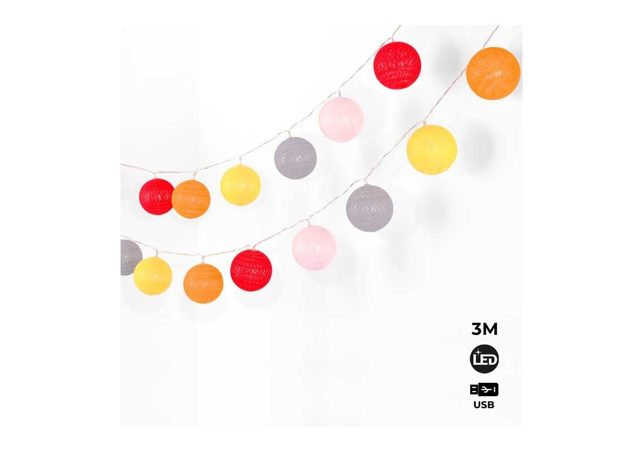 Guirlande lumineuse exterieur d'une longueur totale de 290 cm,composée de 24 boules de 7 cm de diamètre. Elle diffuse une lumière blanc chaud (2700K) agréable et intimiste. Très décorative avec ses boules en coton coloré, cette guirlande lumiere apportera la touche finale parfaite à votre chambre, salon, terrasse couverte, etc. Indice de protection IP44,se branchepar USB.