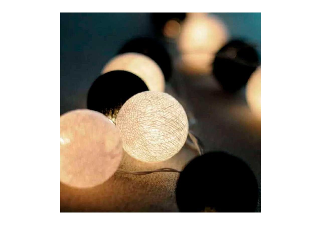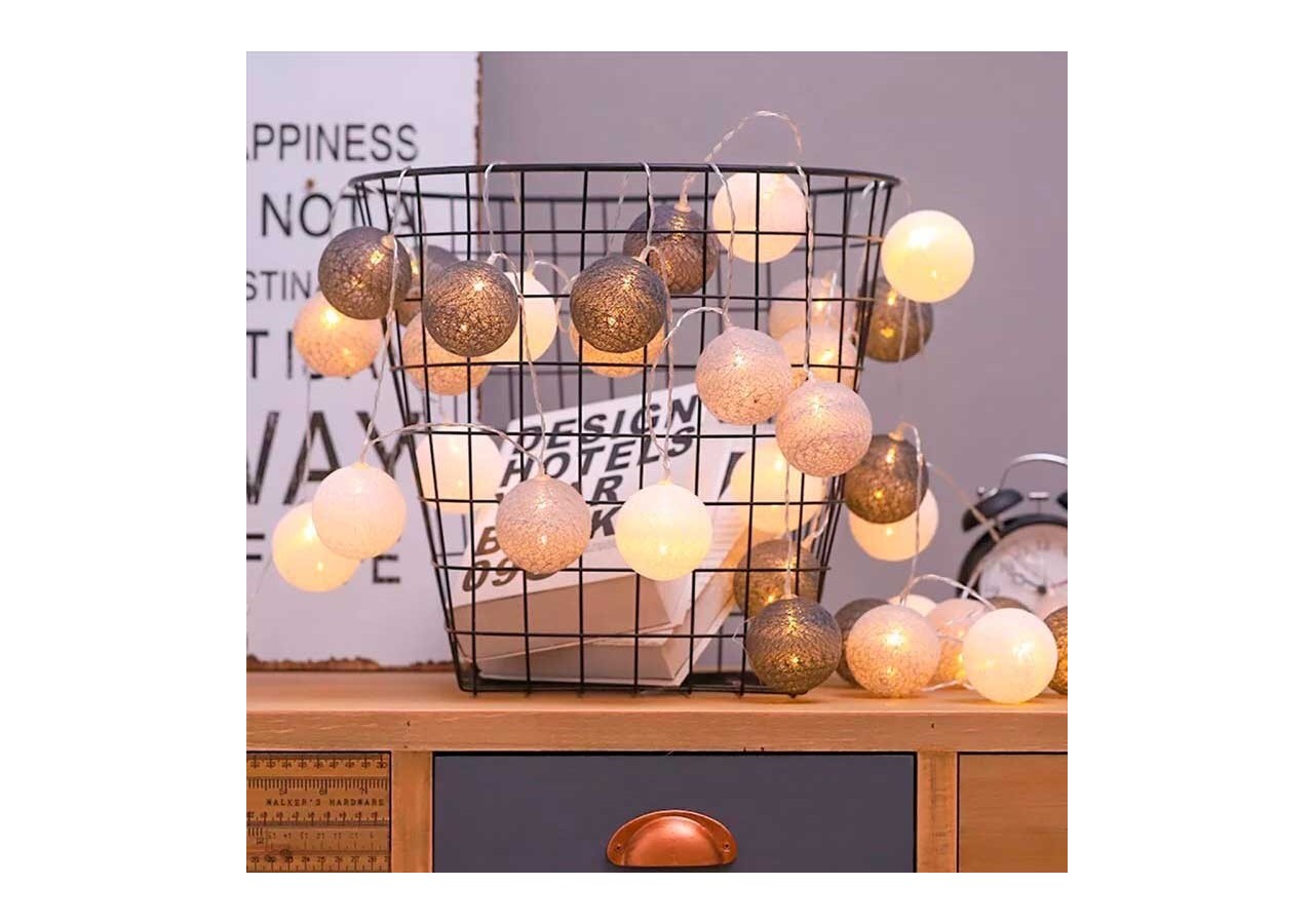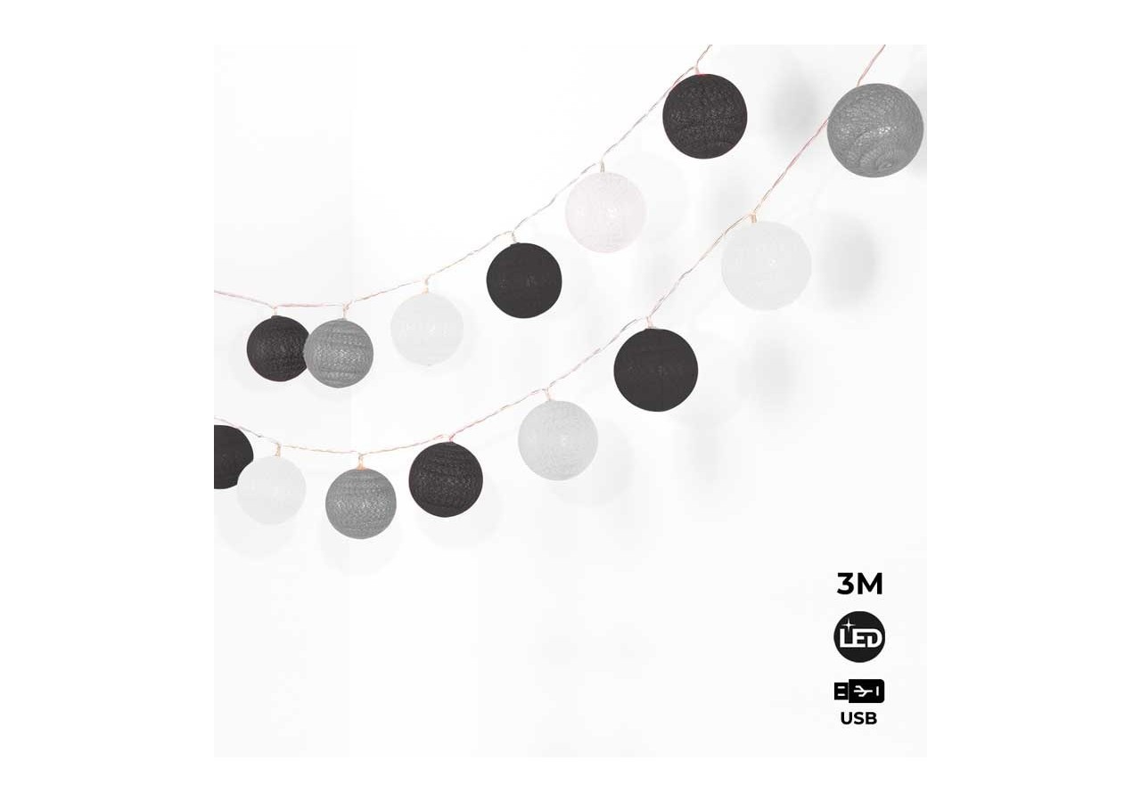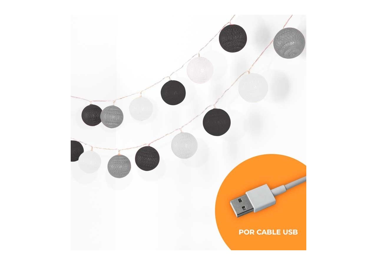 Guirlande lumineuse exterieur d'une longueur totale de 290 cm,composée de 24 boules de 7 cm de diamètre. Elle diffuse une lumière blanc chaud (2700K) agréable et intimiste. Très décorative avec ses boules en coton coloré, cette guirlande lumiere apportera la touche finale parfaite à votre chambre, salon, terrasse couverte, etc. Indice de protection IP44,se branchepar USB.