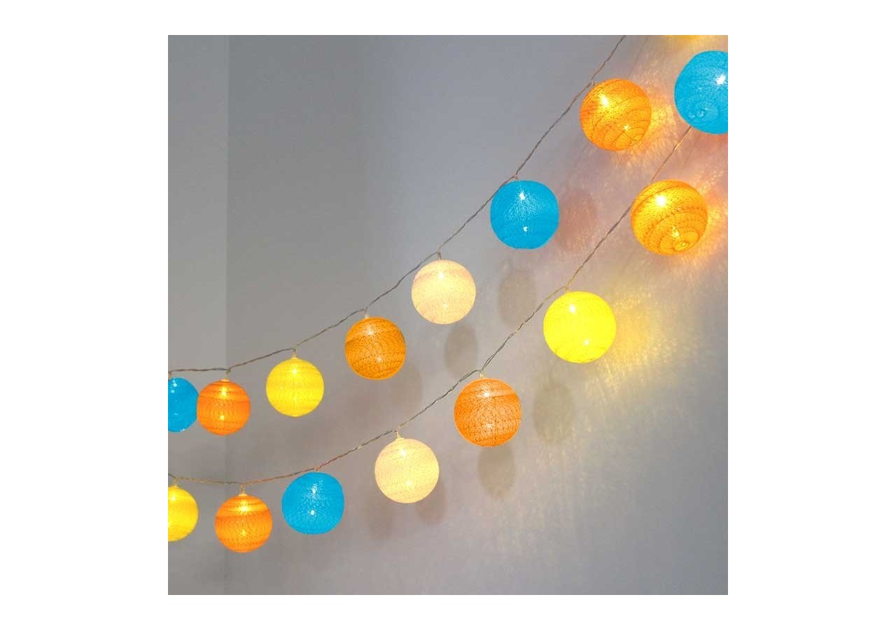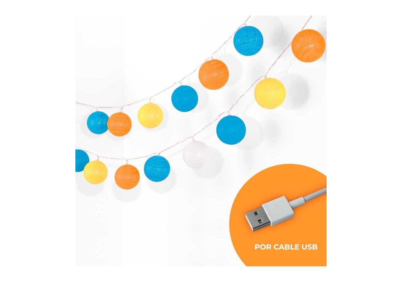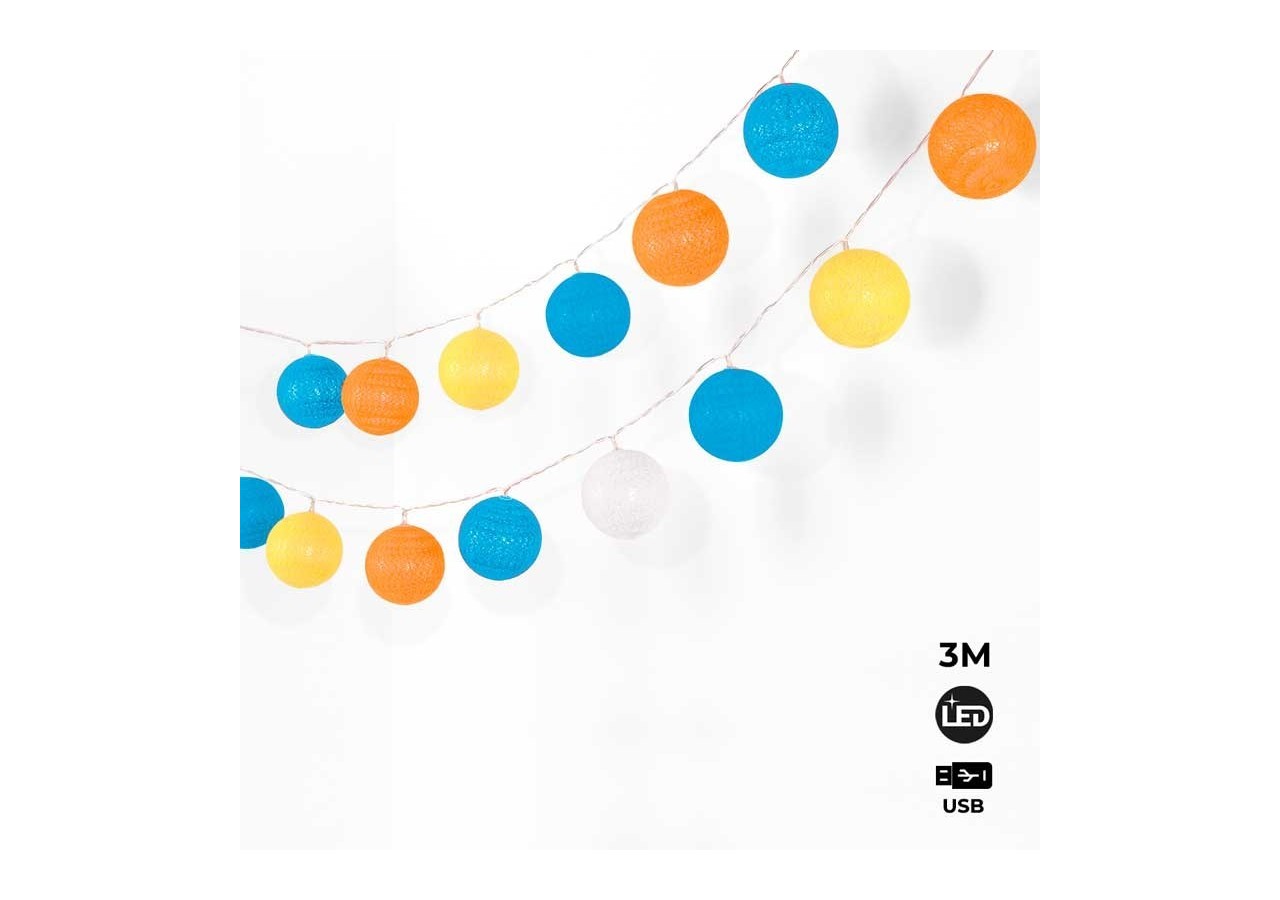 Guirlande lumineuse exterieur d'une longueur totale de 290 cm,composée de 24 boules de 7 cm de diamètre. Elle diffuse une lumière blanc chaud (2700K) agréable et intimiste. Très décorative avec ses boules en coton coloré, cette guirlande lumiere apportera la touche finale parfaite à votre chambre, salon, terrasse couverte, etc. Indice de protection IP44,se branchepar USB.