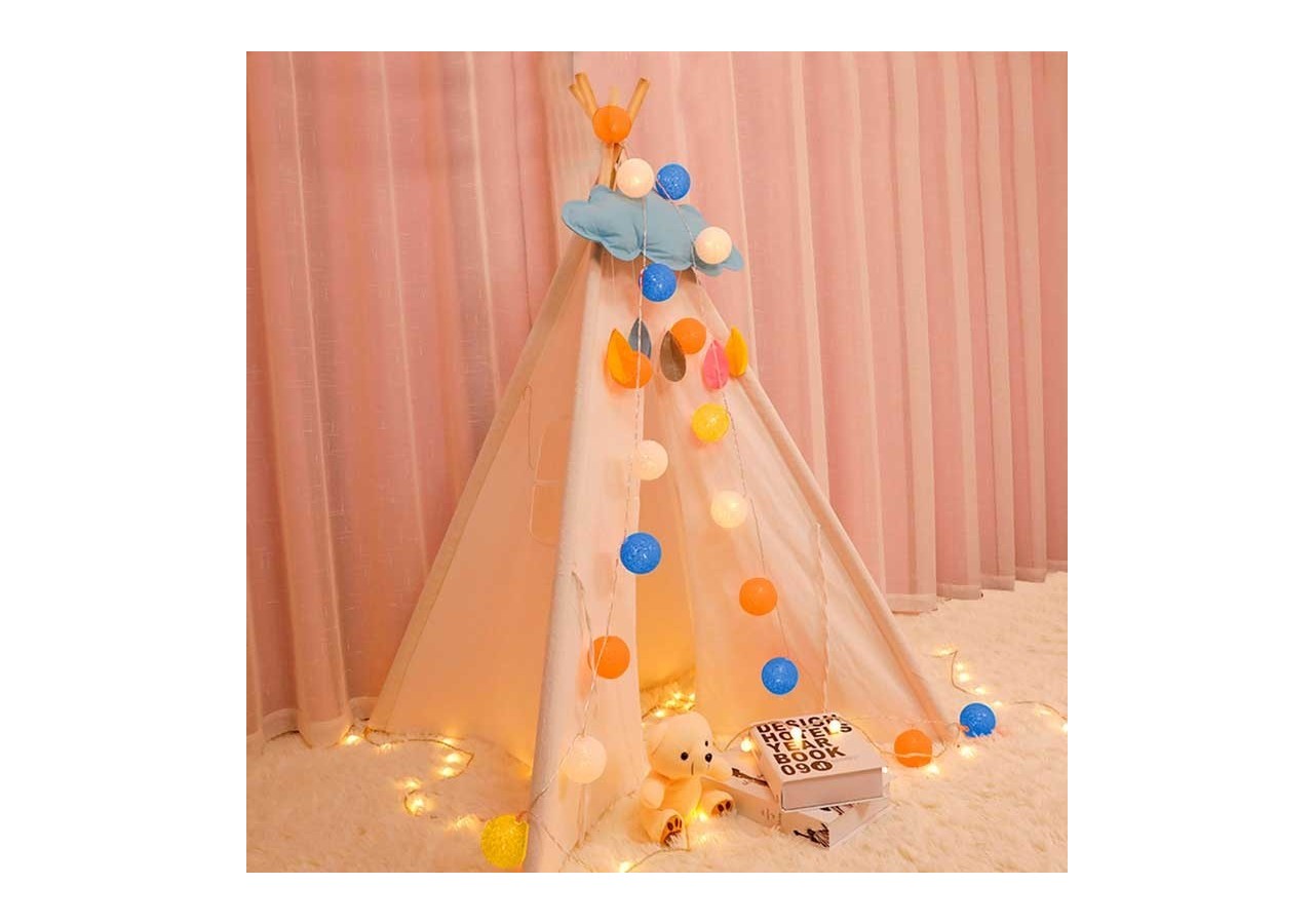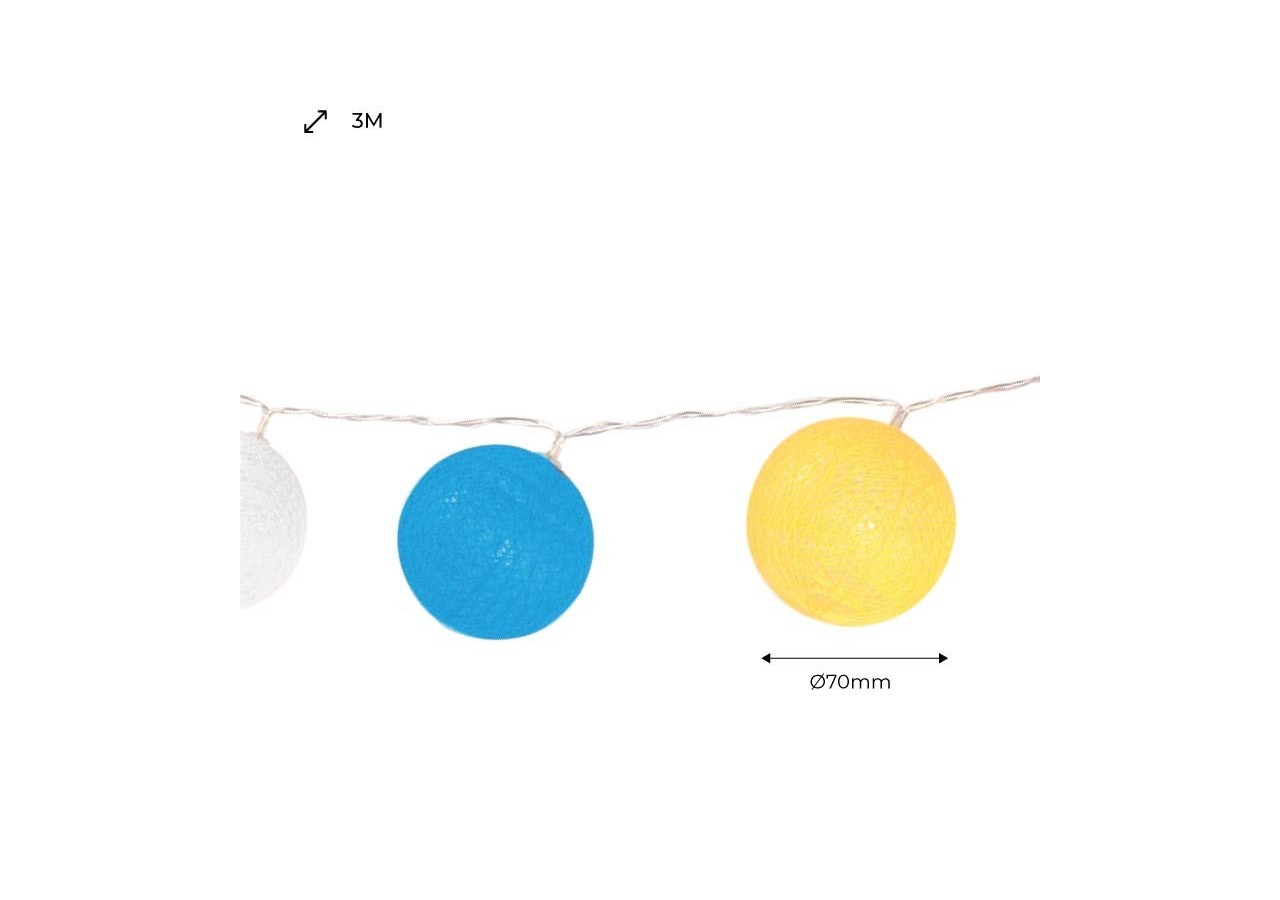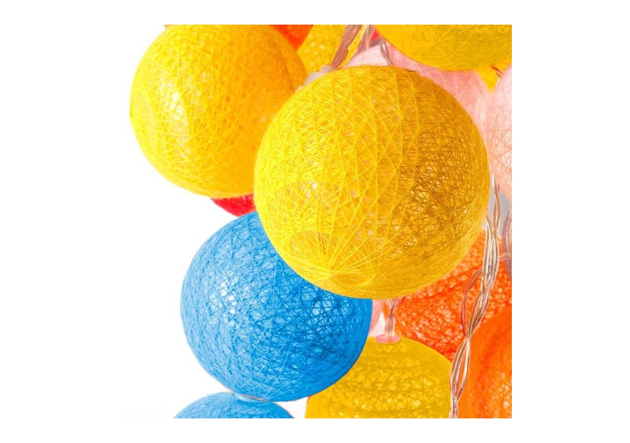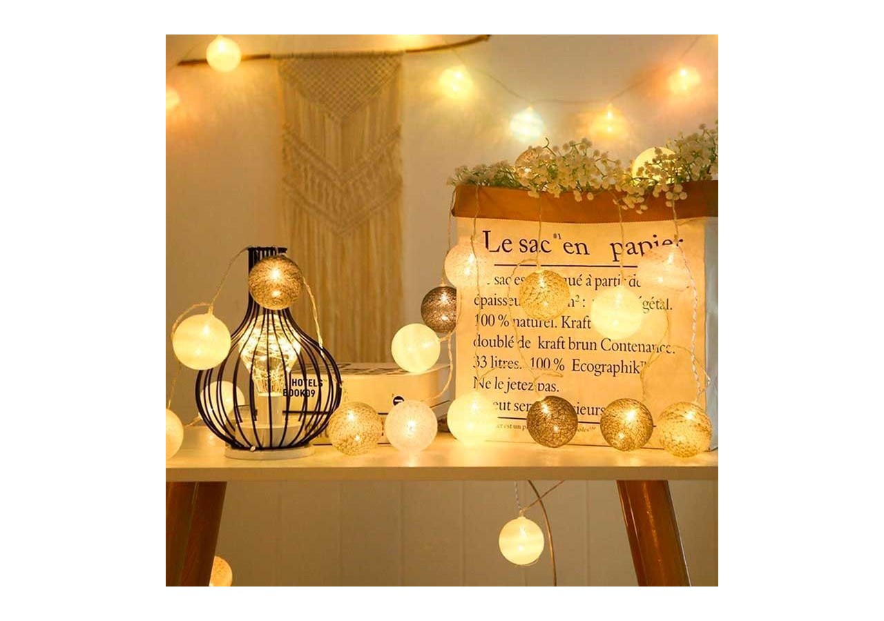 Guirlande lumineuse exterieur d'une longueur totale de 290 cm,composée de 24 boules de 7 cm de diamètre. Elle diffuse une lumière blanc chaud (2700K) agréable et intimiste. Très décorative avec ses boules en coton coloré, cette guirlande lumiere apportera la touche finale parfaite à votre chambre, salon, terrasse couverte, etc. Indice de protection IP44,se branchepar USB.