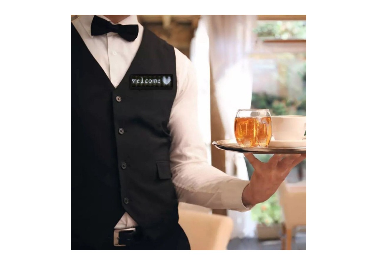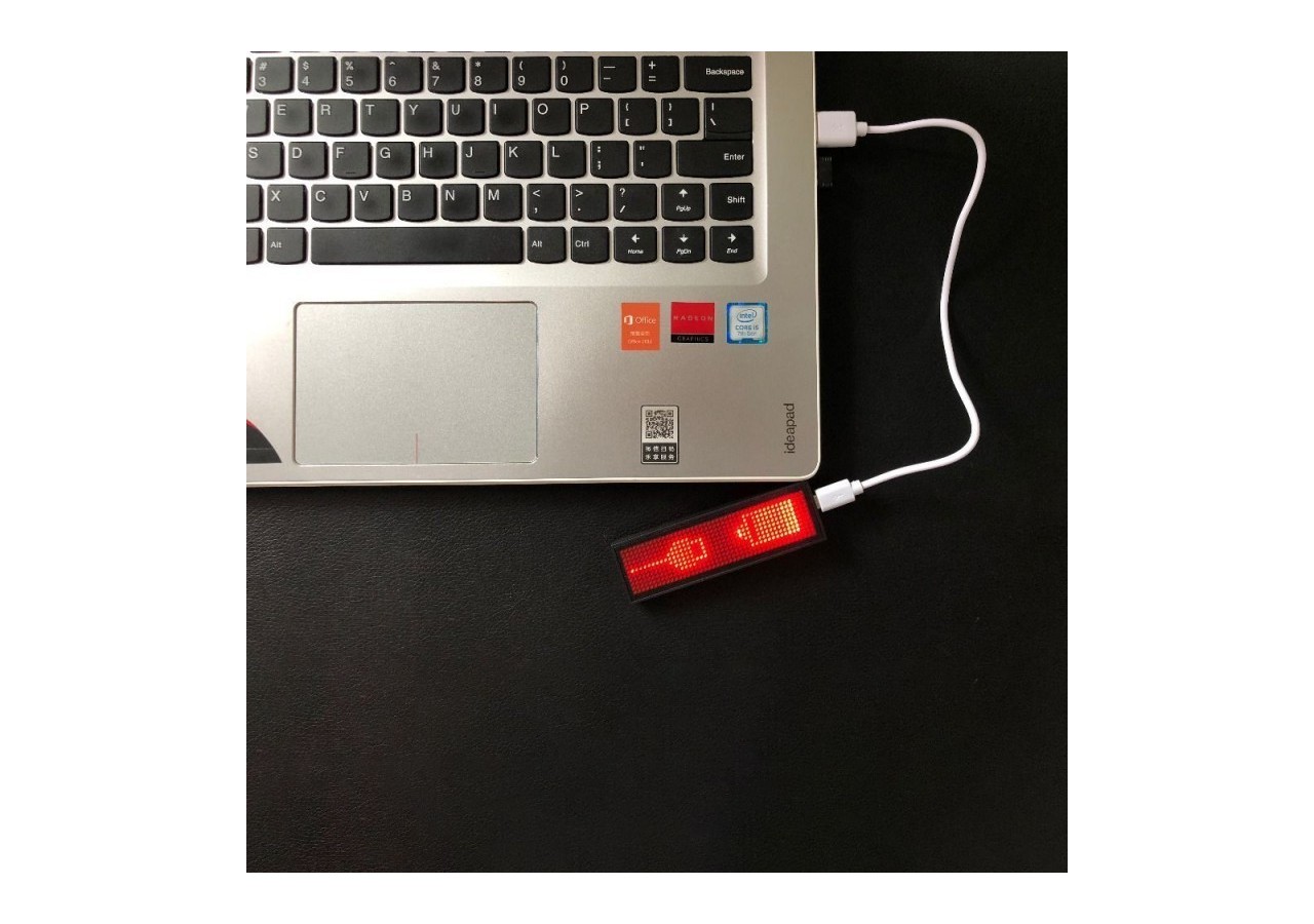 Mini enseigne à LED monocolore, programmable par USB, disponible en rouge. Permet de programmer jusqu'à 700 caractères ASCII, 3 niveaux de luminosité et 28 effets de mouvement prédéfinis. Comprend un système d'aimant et une broche pour le placement.