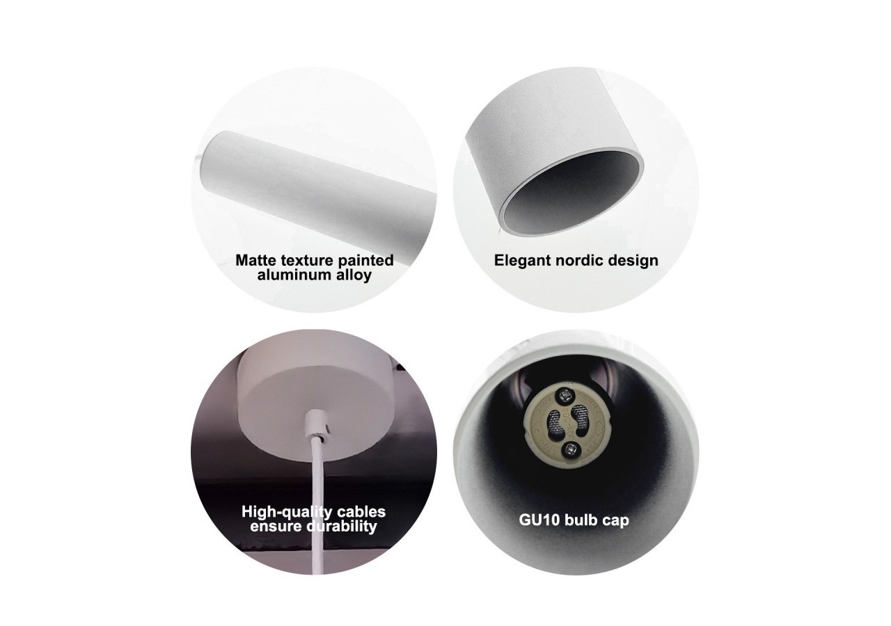 Suspension "Selman"au design moderne minimaliste. Son corps cylindrique en forme de tube est entièrement fabriqué en aluminium de la meilleure qualité. Disponible en deux finitions : laquage blanc ou noir. Douille GU10, ampoule non fournie (puissance max. 50W).