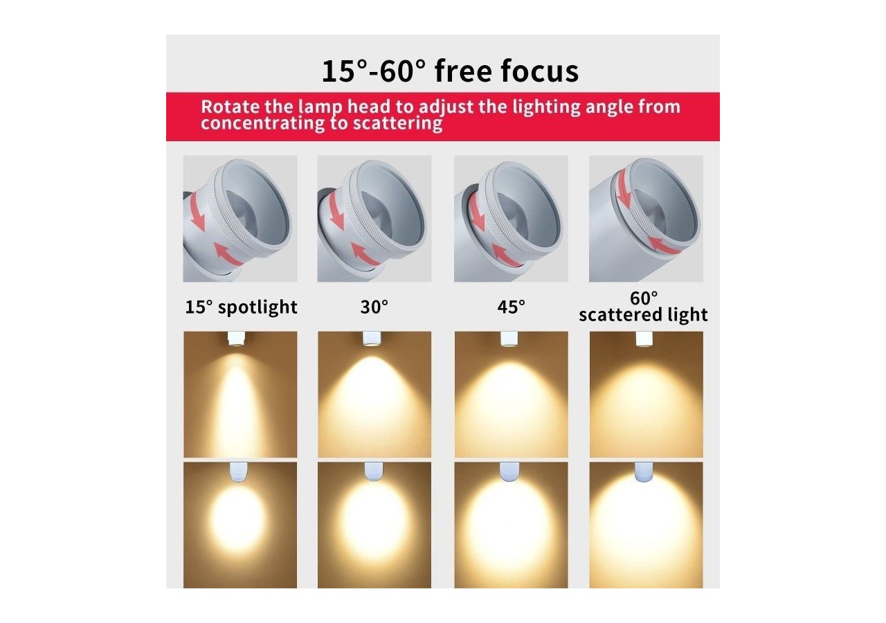 Spots LED orientables à 360 degrés,dont l'angle d'ouverture est ajustable de 15º à 60º. Design moderne élégant en aluminium de qualité supérieure, disponible en noir ou blanc. Puces LED COB à haute efficacité énergétique, totalisant 900 lumens pour 12W. Température de couleur de 2800ºK propice à une atmosphère lumineuse confortable et apaisante. Spot LED avec zoomà installer en intérieur, idéal pour l'éclairage de bureaux, d'hôtels, de salons, de centres commerciaux, de restaurants, de couloirs, etc. Il pivote sur son axe de rotation pour braquer le faisceau dans la direction de votre choix, avec la possibilité d'ajuster l'angle d'ouverture à vos besoins. Dimensions : Ø58x175xØ100mm. Prévoir une découpe de 88mm.