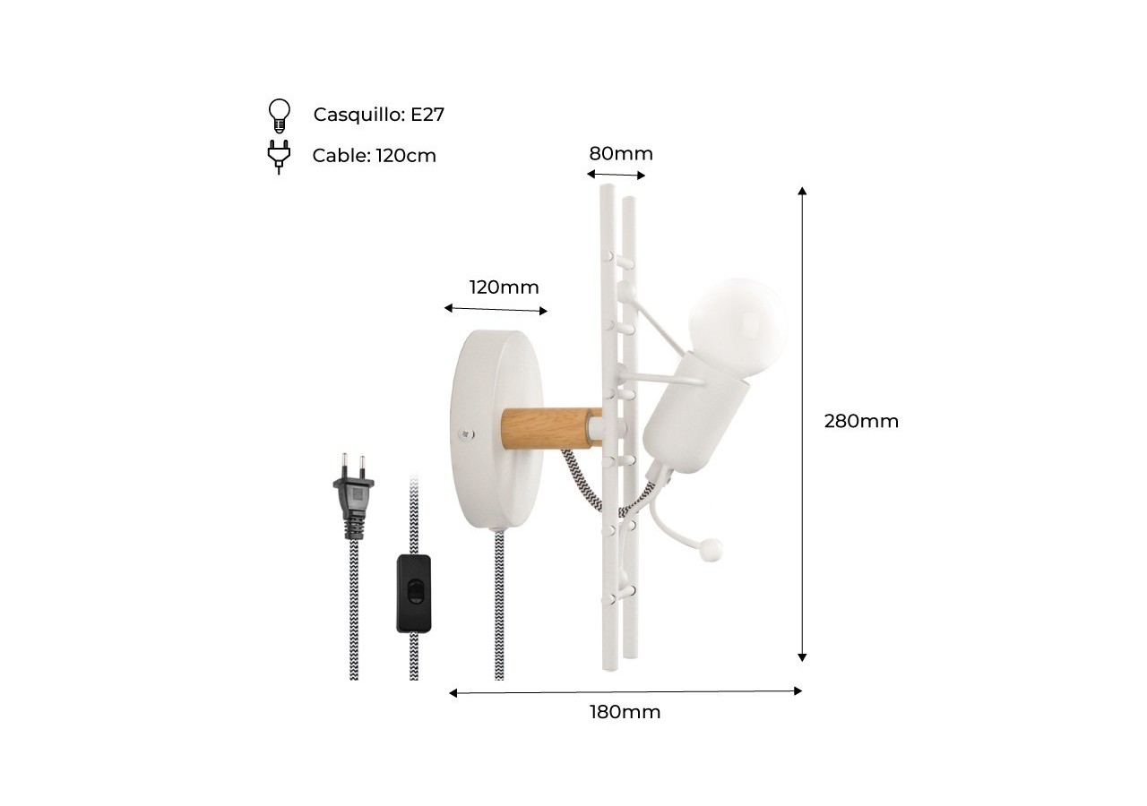Applique murale décorative avec prise et interrupteur. Applique originale figurant un bonhomme articulé grimpant à une échelle, en bois et aluminium de qualité supérieure. Le corps du personnage n'est autre que la douille (E27), surmontée d'une ampoule en guise de tête. Lampe design disponible en plusieurs déclinaisons pour répondre à tous les goûts : vert, blanc, gris et noir. Puissance maximum admise : 40W.