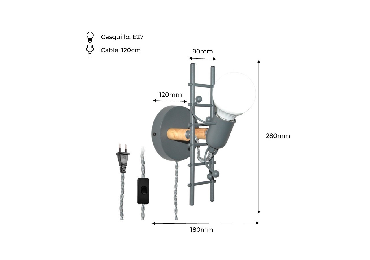 Applique murale décorative avec prise et interrupteur. Applique originale figurant un bonhomme articulé grimpant à une échelle, en bois et aluminium de qualité supérieure. Le corps du personnage n'est autre que la douille (E27), surmontée d'une ampoule en guise de tête. Lampe design disponible en plusieurs déclinaisons pour répondre à tous les goûts : vert, blanc, gris et noir. Puissance maximum admise : 40W.