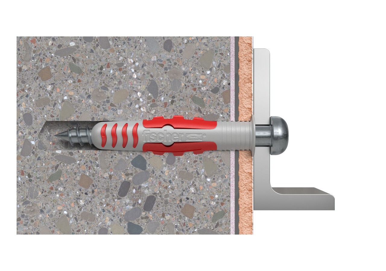 La cheville fischer DuoSeal est une cheville bimatière qui scelle le trou de forage dans les zones humides sans aucun produit d'étanchéité supplémentaire. La cheville en nylon, avec la vis fournie, a été testée par l'Institut de test et de certification de la Säure Fliesner Vereinigung e. V.. L'étanchéité à l'eau est confirmée selon ETAG 022 et DIN 18534 jusqu'à la classe d'exposition à l'eau W3-I. En tenant compte des normes d'étanchéité nationales et internationales pour les pièces humides, la DuoSeal en combinaison avec la vis fournie convient aux applications dans les zones humides commerciales, privées et publiques fréquemment exposées aux éclaboussures d'eau et à l'accumulation occasionnelle d'eau. Dans tous les cas, veuillez tenir compte des réglementations nationales relatives à l'utilisation de chevilles dans les zones humides.