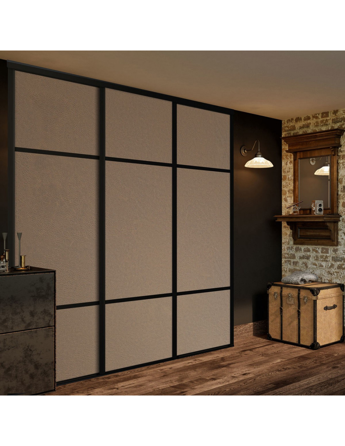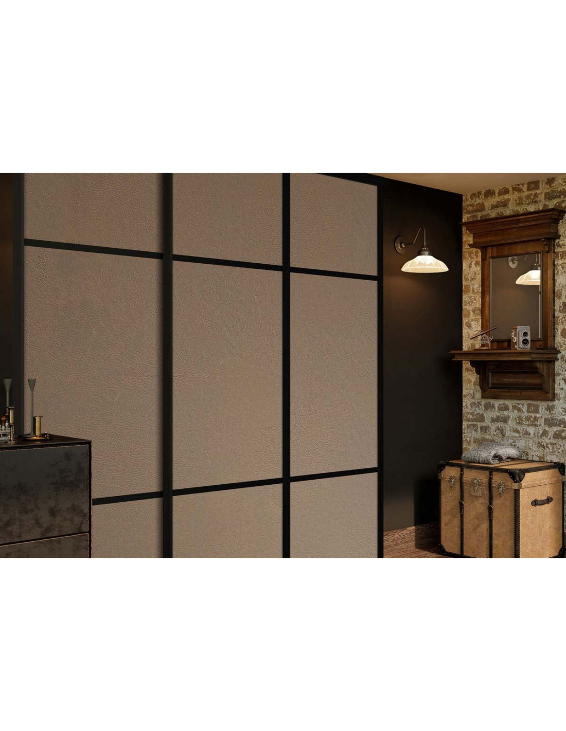 Cette façade de placard est composée de portes coulissantes en cuir vintage.