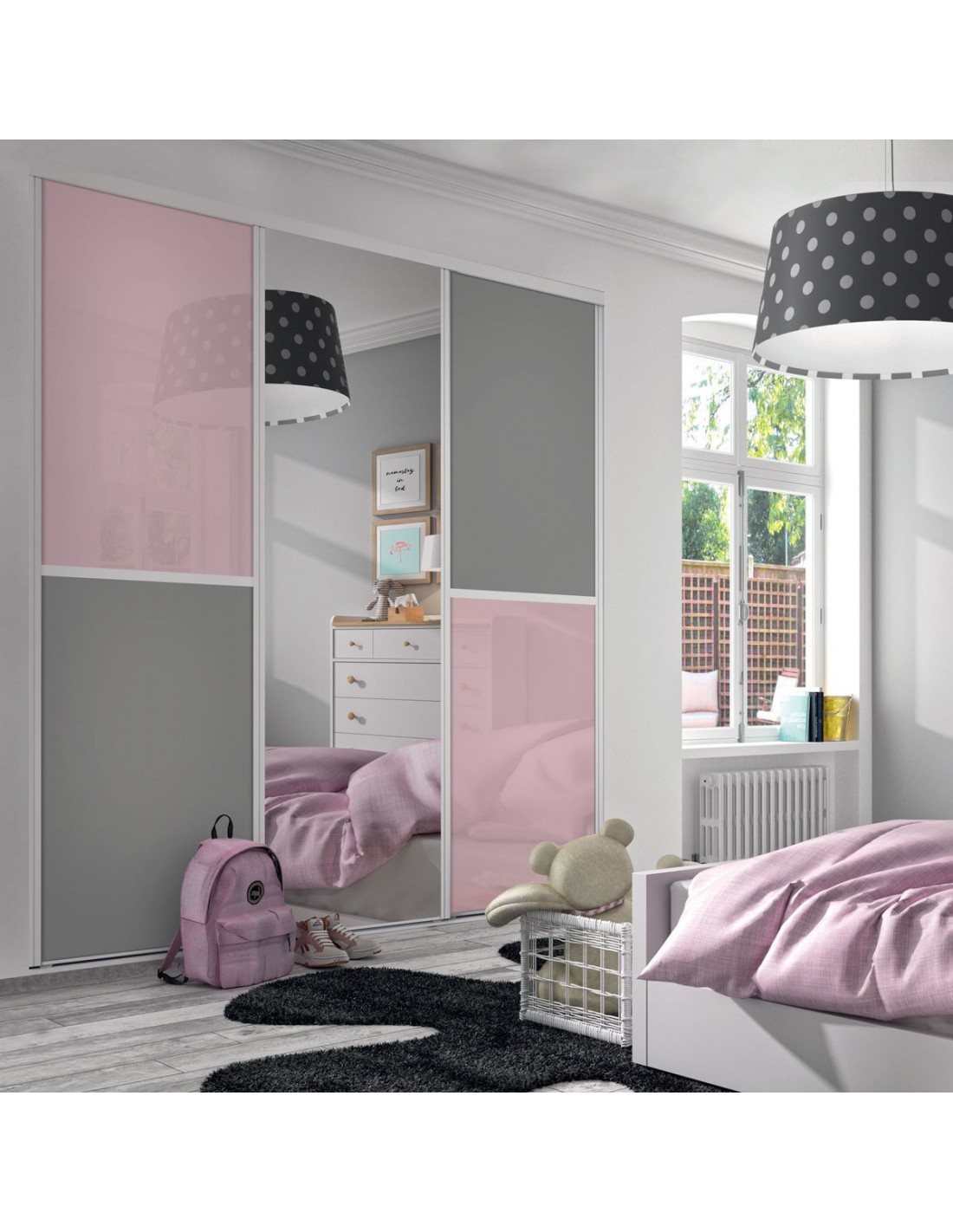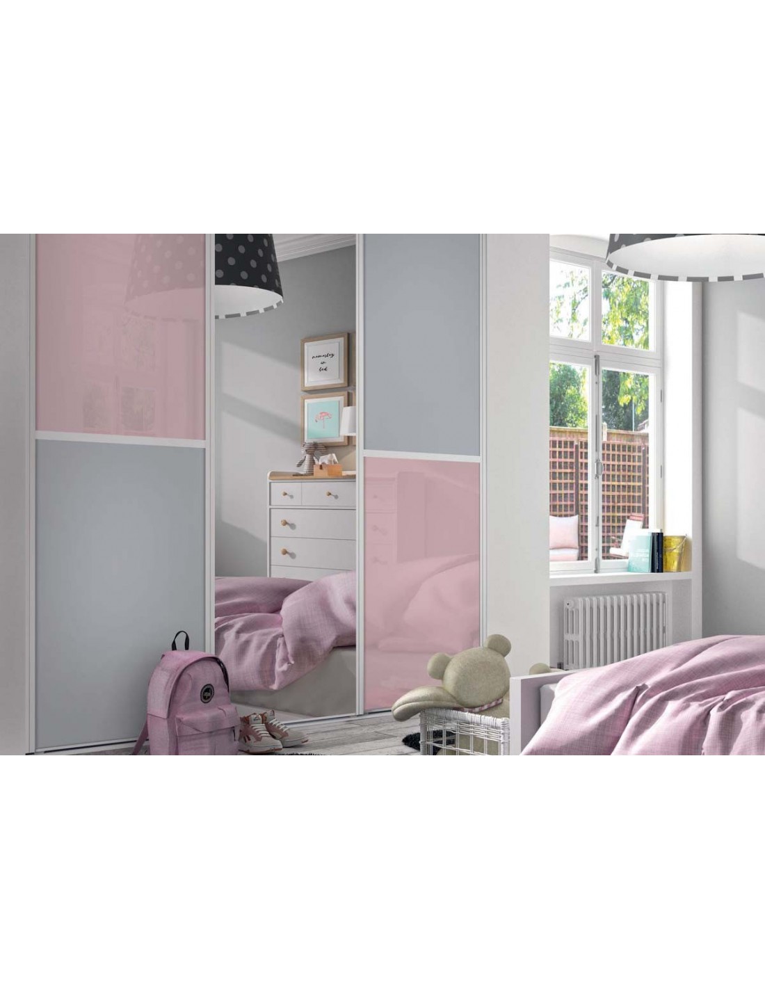 Cette façade de placard est composée de portes coulissantes en verre laqué, mélaminé et miroir argent.