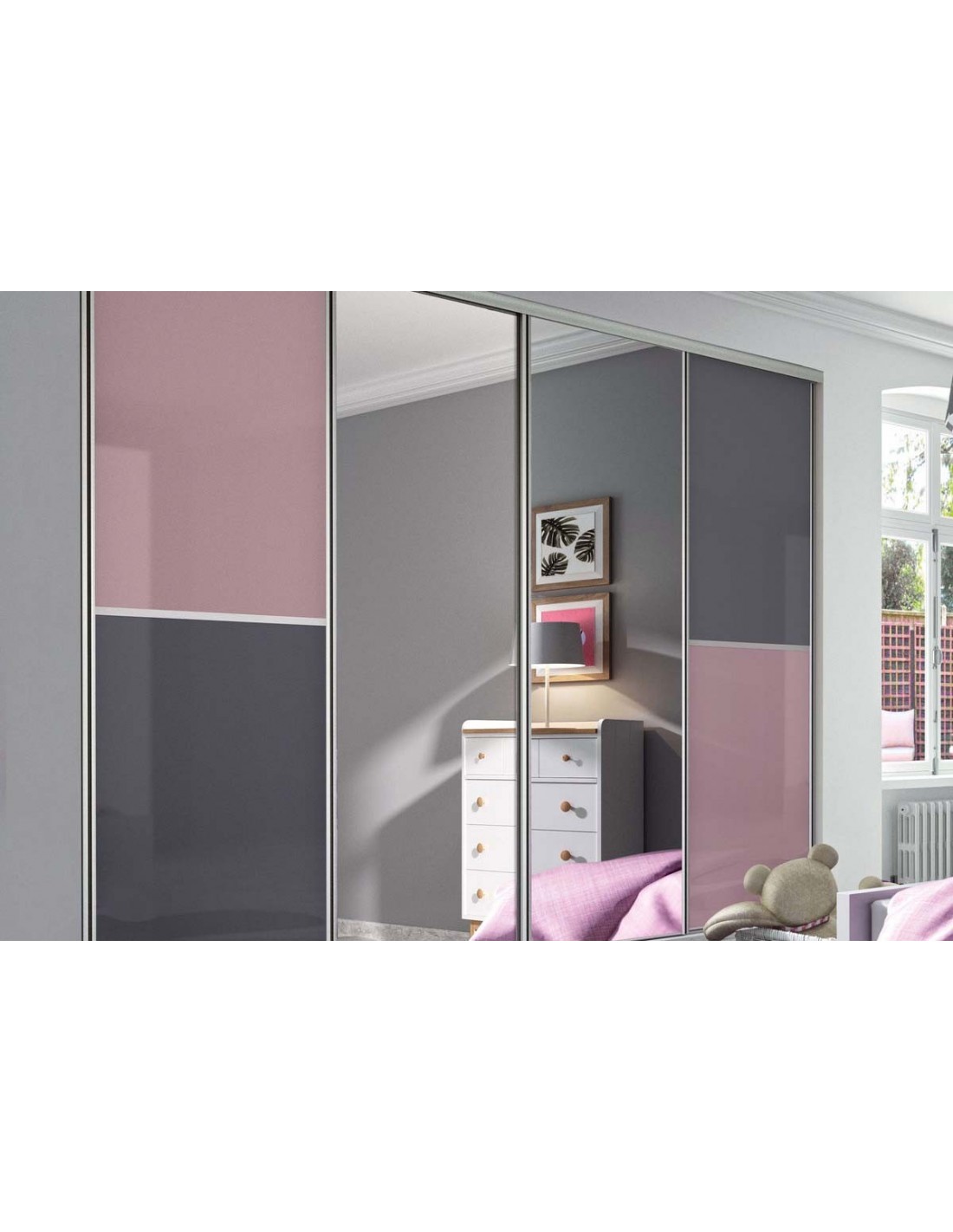 Victoria : Façade de placard coulissante 4 portes miroir et décor verre laqué