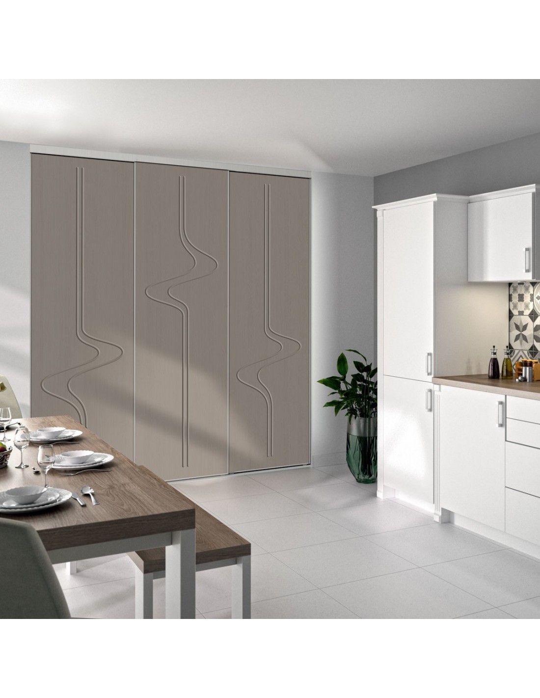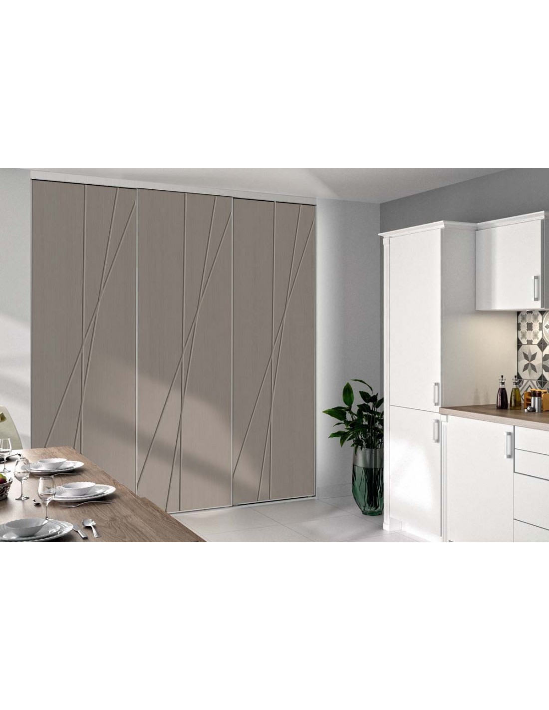 Cette façade de placard est composée de portes coulissantes en décors graphic argile glacé.