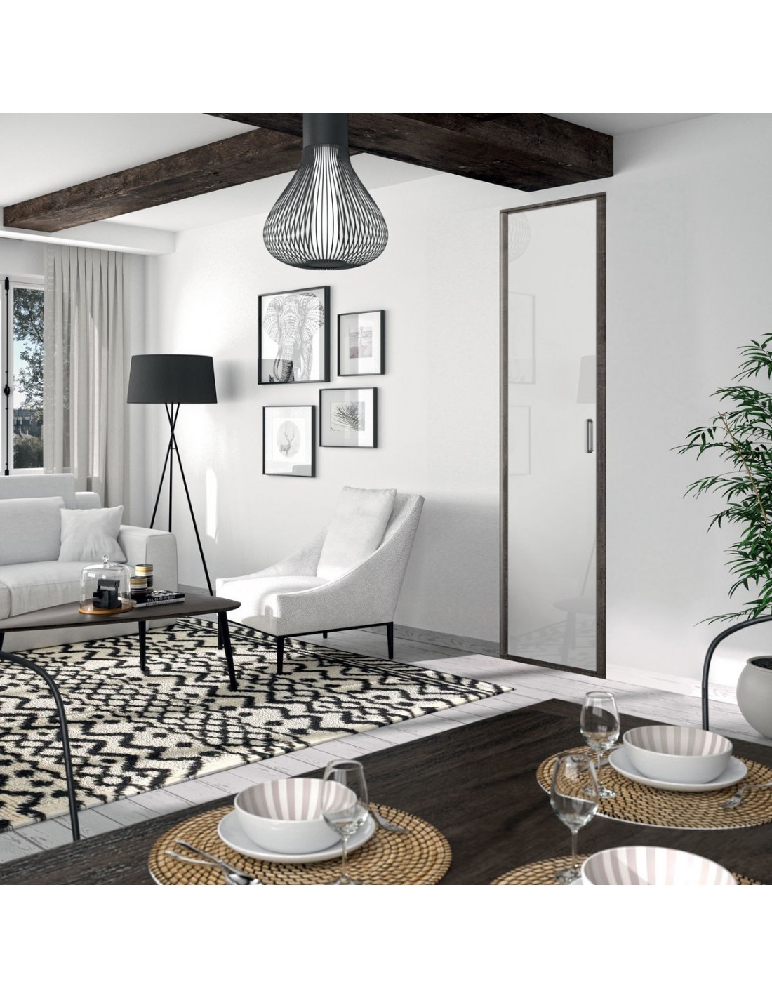 Cette façade de placard est composée de portes pivotantes en verre laqué.