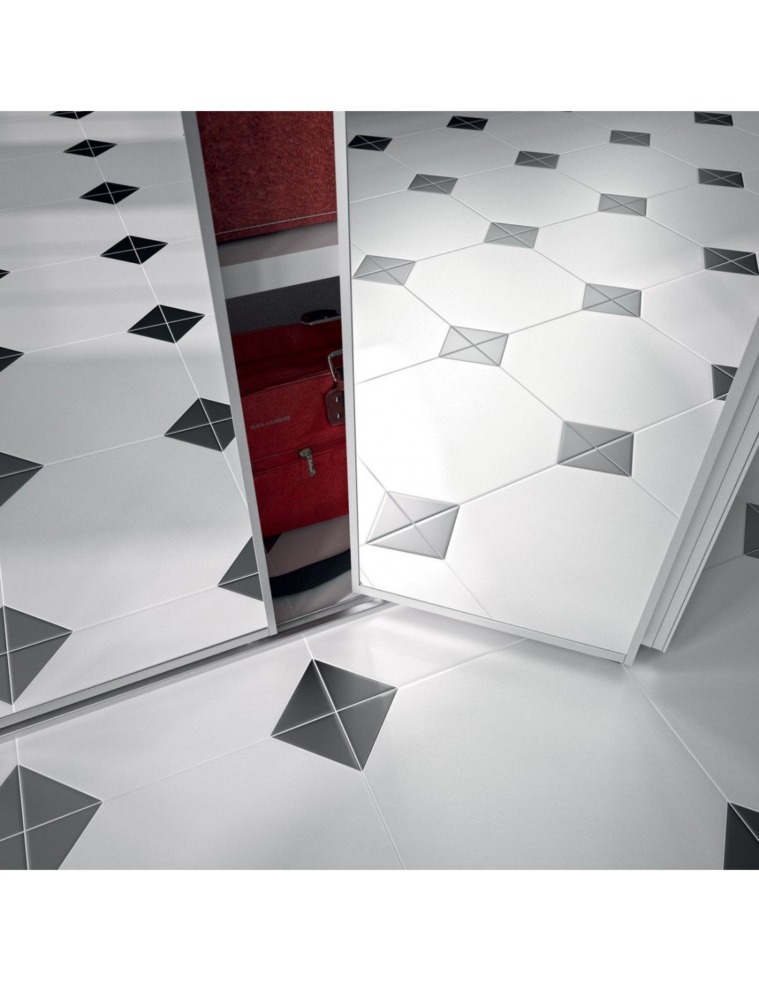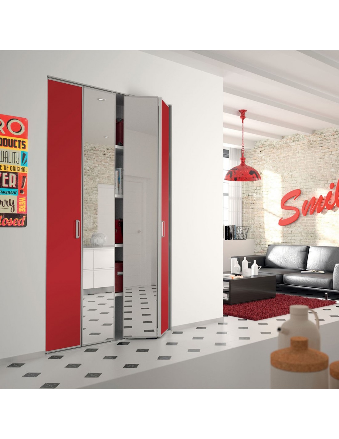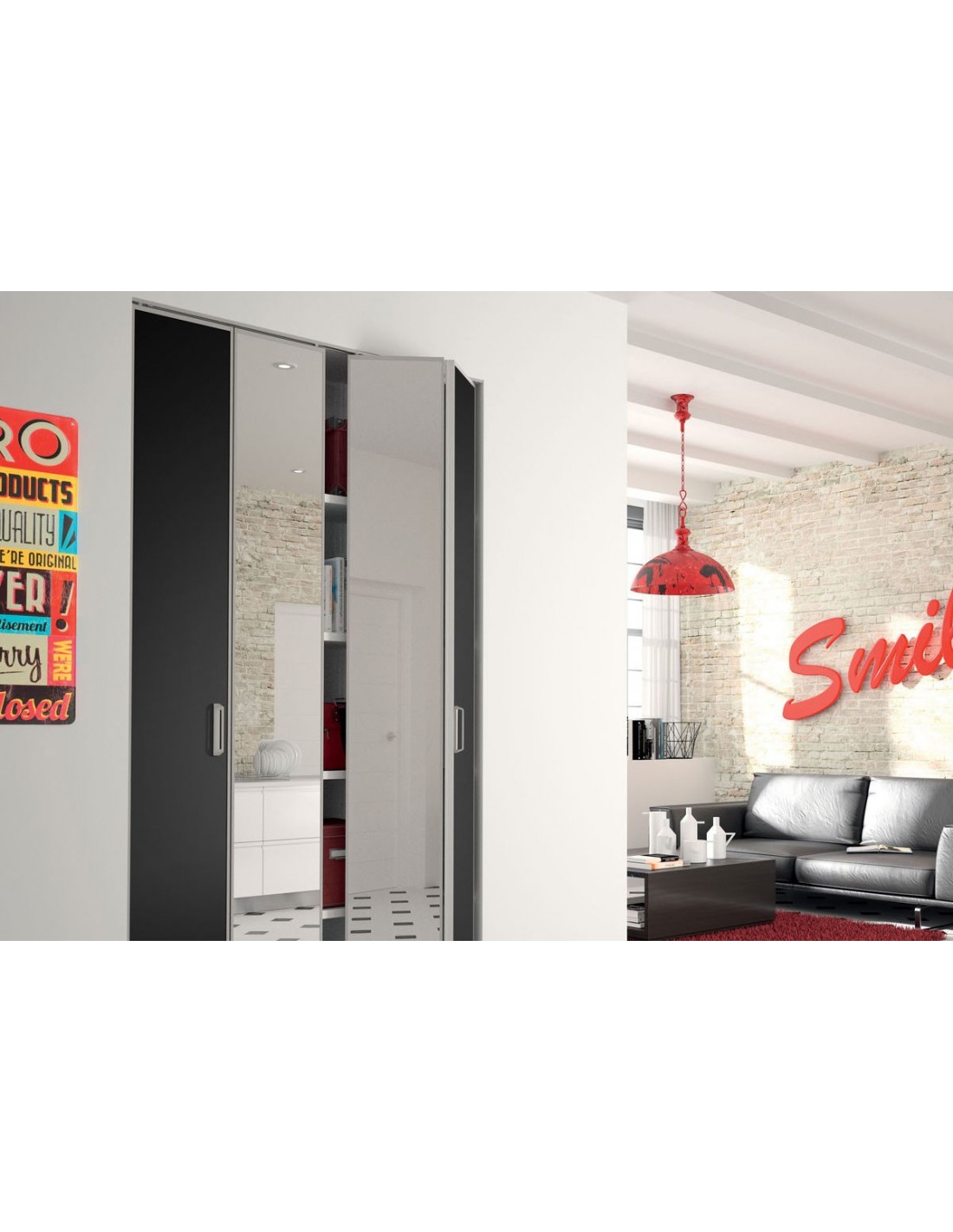 Cette façade de placard est composée de portes pliantes en mélaminé et miroir argent.