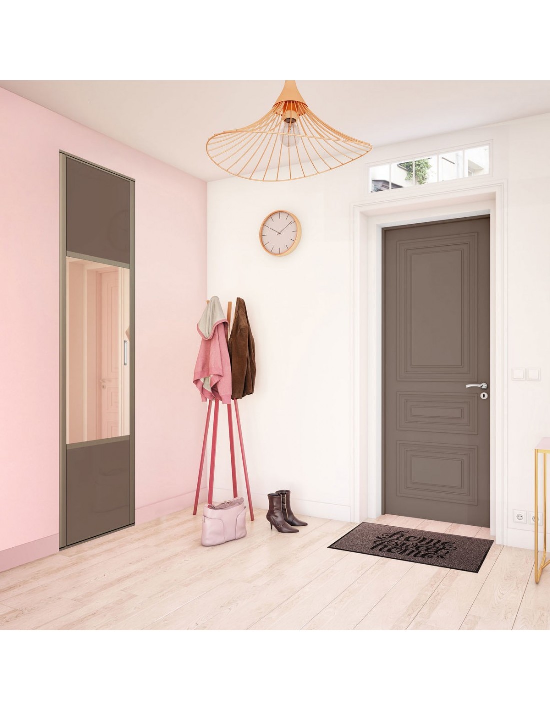 Cette façade de placard est composée de portes pivotantes en verre laqué et miroir bronze.