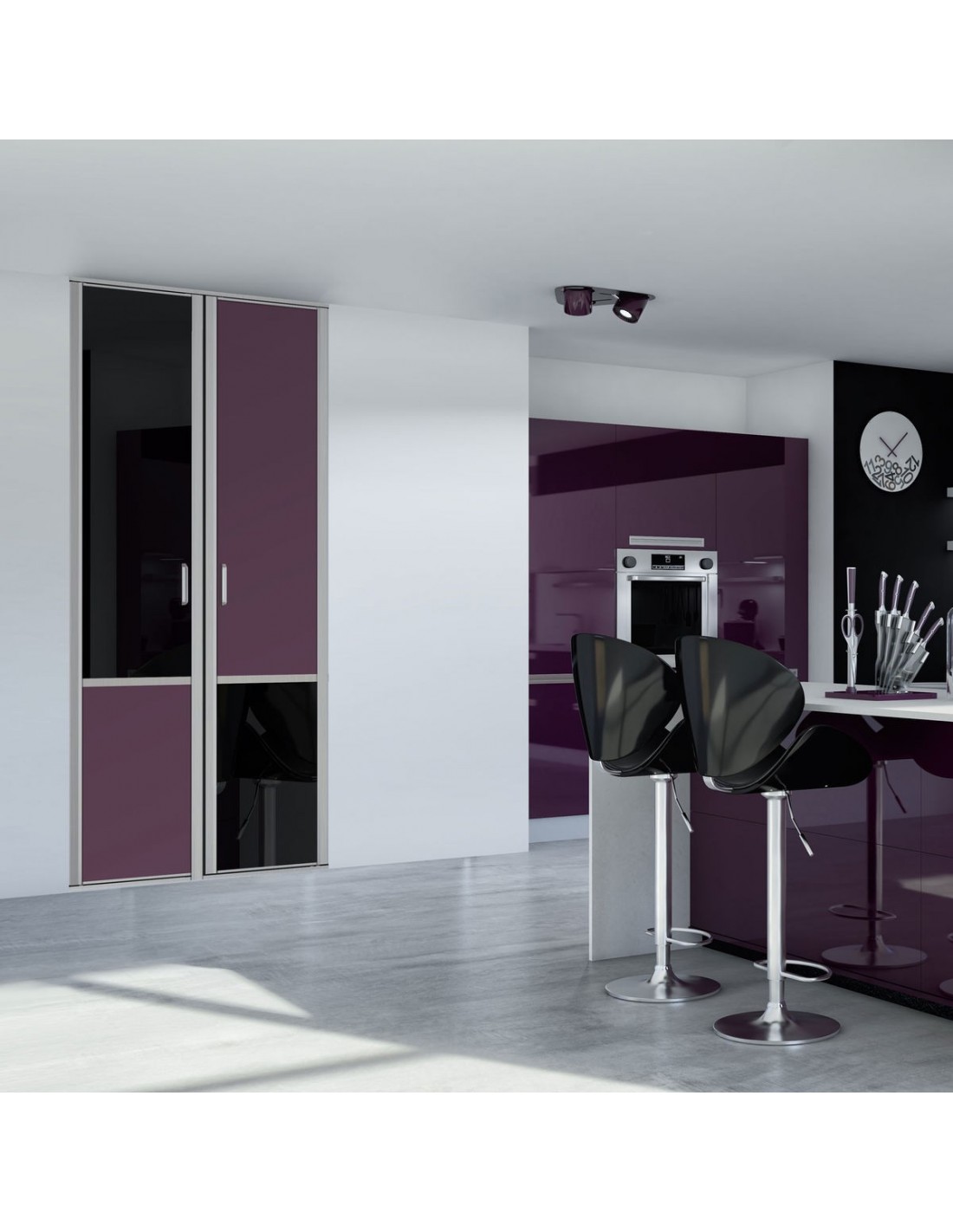 Cette façade de placard est composée de portes pivotantes en verre laqué et/ou mélaminé.