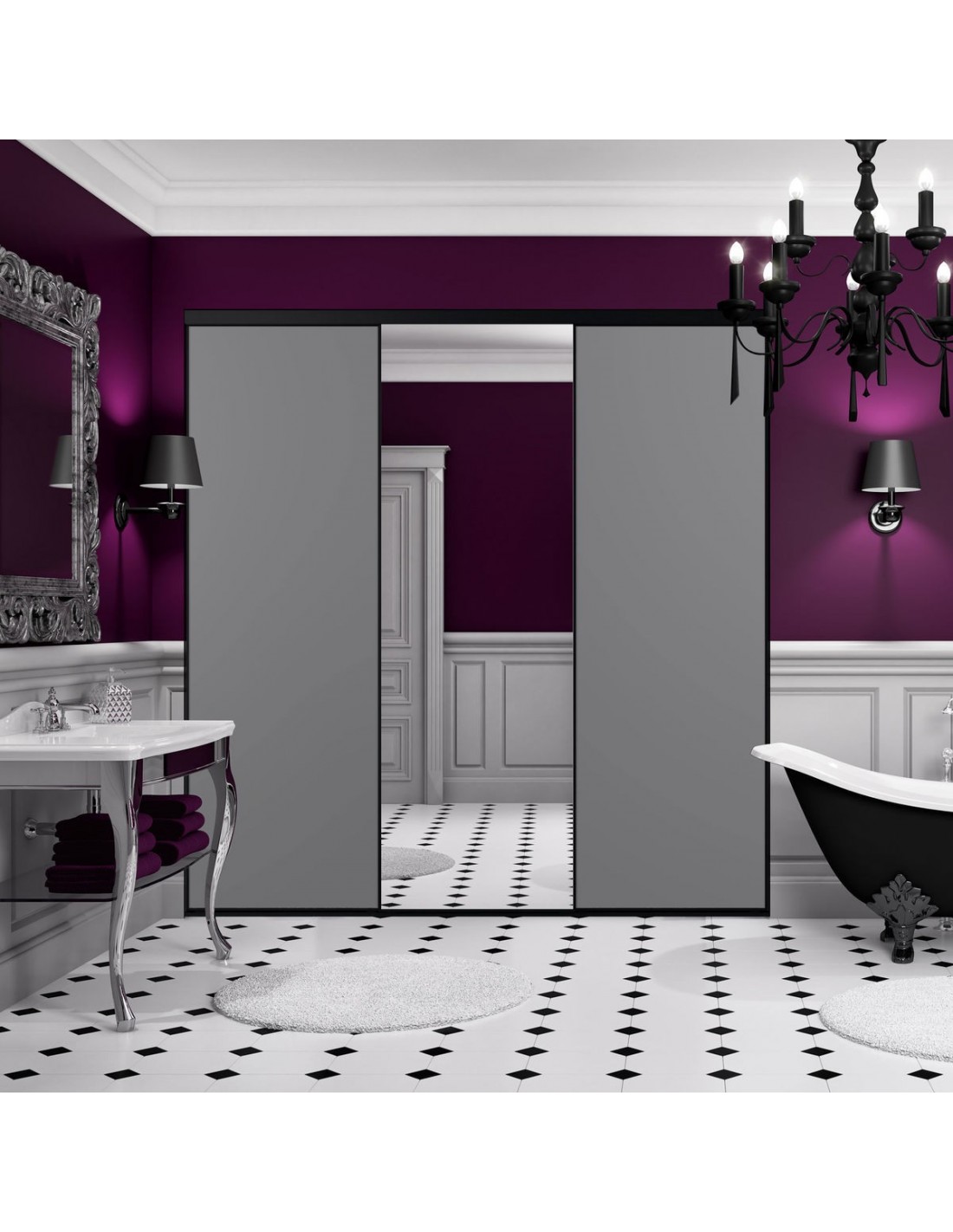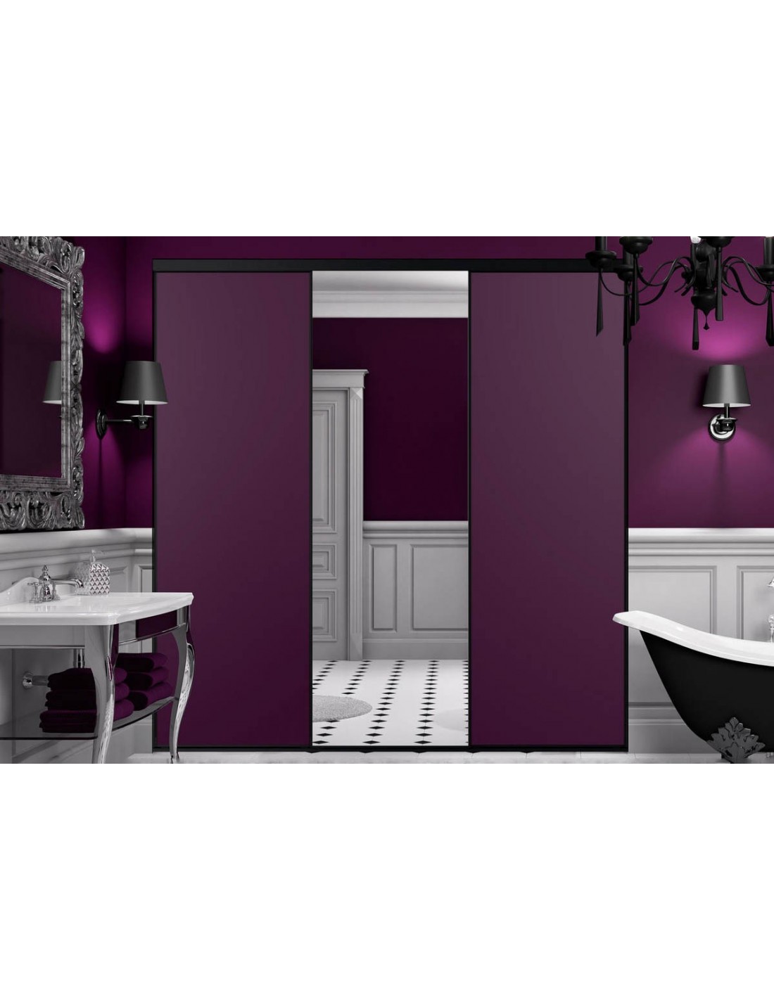 Cette façade de placard est composée de portes coulissantes en verre laqué et miroir argent.