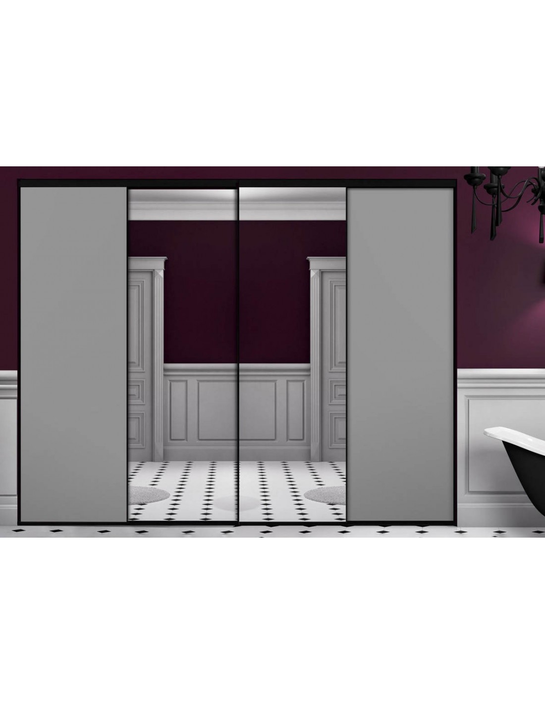 Cette façade de placard est composée de portes coulissantes en mélaminé et miroir argent.