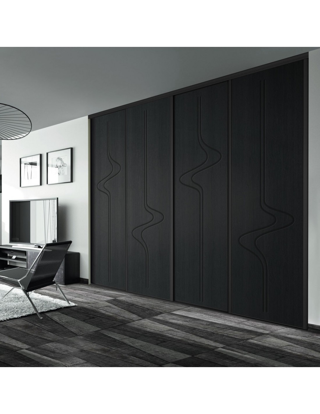 Cette façade de placard est composée de portes coulissantes en décors graphic noir glacé.