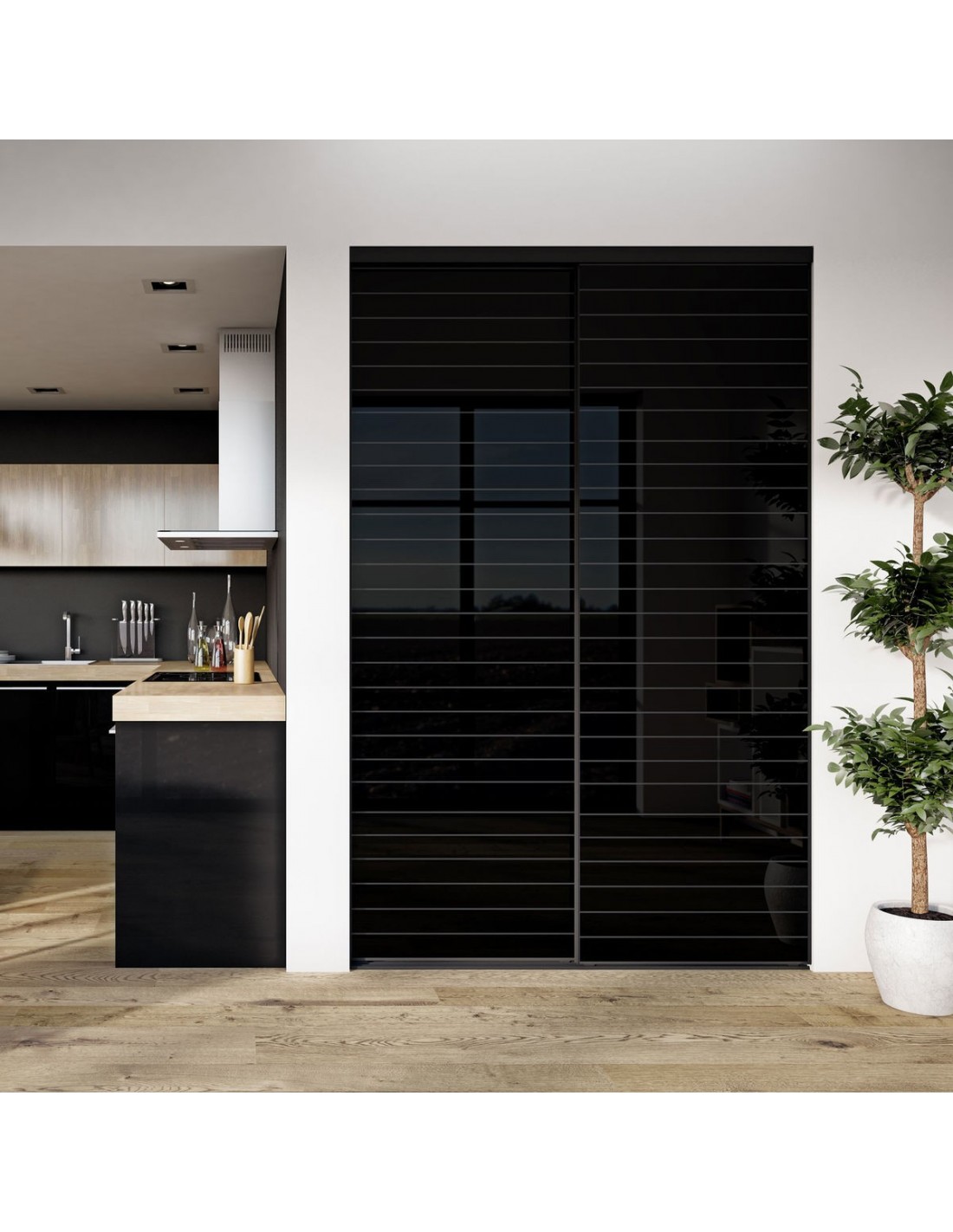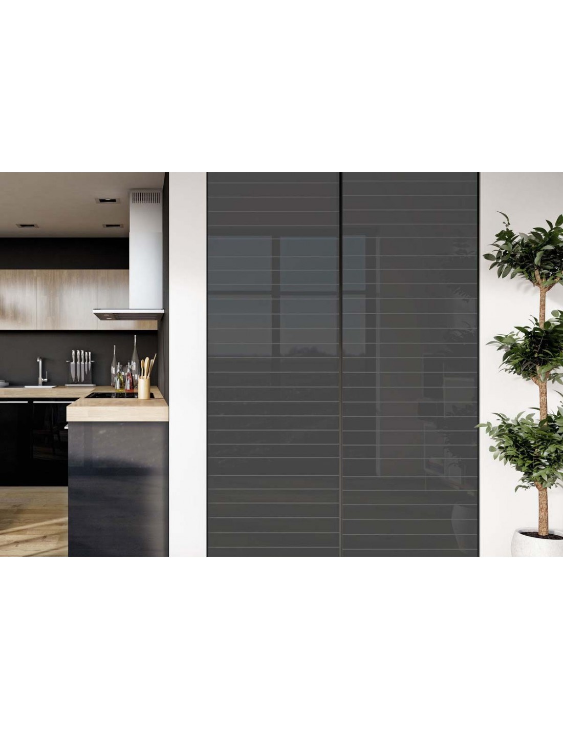 Cette façade de placard est composée de portes coulissantes en verre laqué rainuré.